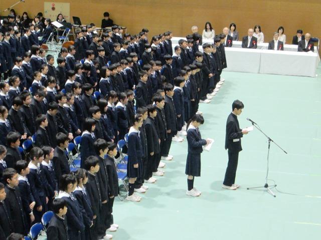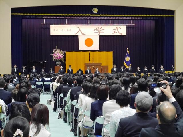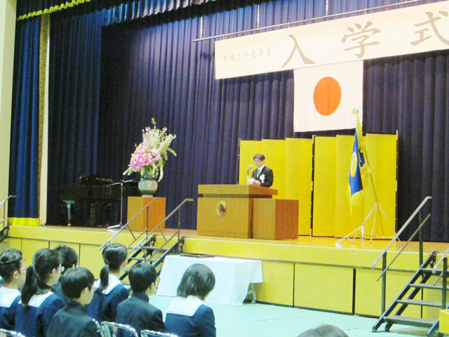 式辞では、読売新聞の「編集手帳」欄に紹介されていた川崎洋の『存在』という詩を紹介し、そこから本校の教育目標の一つである「逞しく生きる力」についての話をした。「”みんな”の中にいる自分を意識してください。そして、自分はこういう名前であり、こういう考えを持つ人間であると主張してください。決して”みんな”の中に埋もれて陰でこそこそするようなことはしないでください。君の名前に誇りを持って、正々堂々と振る舞ってください。そして、それと同様に他の人の名前を尊重してください。名前もなく、その存在を隠して行う悪を憎んでください。それが、この学校においての『逞しく生きる力』であり、世の中へ出ても通用する力だと思います。君たちがこの学校で逞しく生きてくれることを心から望みます」と語りかけた。