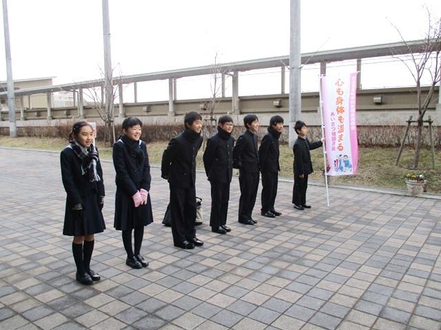 2月2日(木)、明日は節分、明後日は立春というが、朝から小雪が舞う寒い朝である。今週から中高生徒会とM1・2の企画委員会が一緒になって「冬のあいさつ運動」を始めている。通常から生徒会の役員たちが正門前であいさつ運動を行っているのだが、今回は奈良県高等学校生徒会連絡会の「心も身体も温まるあいさつ強化月間」という呼びかけに応えて、生徒昇降口前での実施となったということである。きちんと幟を持って、代表者たちが大きな声で「おはようございます!」と呼びかけるが、コートやマフラーに首をすくめた生徒たちはコックリとうなずくだけの者が多い。しっかりと挨拶を返す方がシャキッとするのにとは思うが、今日の寒さではそうもいかないのだろうか。寒い中を頑張った生徒会諸君の爽やかさが印象に残った。