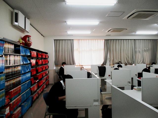 総合グラウンドを離れて、Y棟前にある校訓碑の前に行ってみた。これは高校第1期生の卒業記念品として寄贈されたものである。碑の両側にある桜の木は、もちろん裸の枝を寒さに晒して凍えていた。でも、よく言われるように、その木にはもうすでに春の開花のための準備が始まっているのである。そう思った途端、「そうだ! Y4(高3)生のところへ行ってみよう」と思い立った。国公立2次試験の出願も終わり、大学入試もいよいよ最終コーナーである。Y棟4階に上がるとすぐに自習室がある。赤本や青本の棚の上には今年もダルマが置かれている。各自がそれぞれの目標に向かって真剣に取り組んでいる。奥の教室では英語の2次対策講座が行われていた。邪魔をしないようにとこっそり写真を撮り、「頑張れよ!」と胸の内で声を掛けさせてもらった。先ほどの桜が満開になる頃、彼ら全員が笑顔でいてくれればと願うばかりである。
