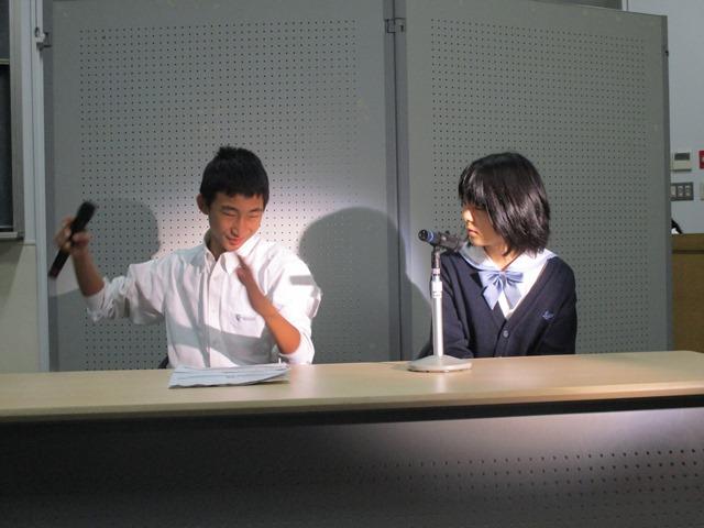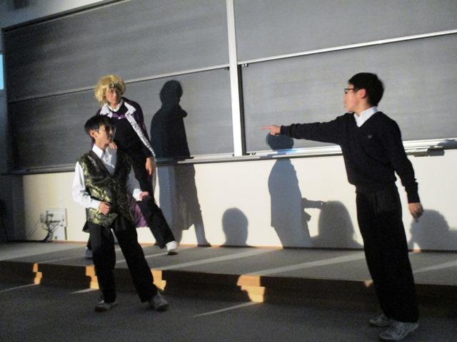 劇はまず舞台上手に設けられた放送席(アナウンサーと解説者がいる)の会話から始まる。ストーリー展開の案内役である。最初の『少年編』では4人の役者が登場する。少年漫画は何と言ってもヒーローの活躍だということで、ヒーローとヒロイン、敵役とその仲間といった設定だそうだ。舞台の流れにはついて行けるのだが、漫画の世界を早口の解説と会話で演じていくという内容そのものに、私自身とのギャップを感じた。これが今の中高生の好みなのかと、何とか自分を納得させながら続きを観る。次の『少女編』は、少女好みのラブストーリーの展開である。分からなくはないが、観ていてちょっとこちらが恥ずかしくなる。でも、客席前列に陣取った女子生徒たちからはぎこちない抱擁シーンに悲鳴と歓声があがる。彼女たちは存分に劇を楽しんでいるようである。また、ここでのアナウンサーと解説役の演技には感心した。最後の『混合編』では前の2つを組み合わせたドタバタめいた展開になる。でも、ここは面白いと感じた。脚本家の意図もここにあるかと思われた。2つが混合した時の矛盾や意外性がうまく笑いとなっているのである。生徒たちの演技も迫力を帯びていて感心した。