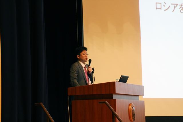 お越しいただいたのは、総合外交政策局安全保障政策課の佐竹博厚氏。ご出身が大阪で、大阪市内の高校に通われていたということもあり、「フランス語と関西弁は堪能なのですが、しばらく使わない英語と、日本語の標準語が苦手なんです」という挨拶から講演が始まった。
