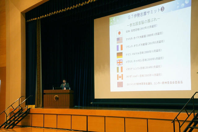 次に、外務省の仕事について話になった。まずは生徒たちに質問する形で進められたのだが、情けないことに指名された生徒はもじもじして、うまく答えられない。やむを得ず、「外国旅行をする時に一番大切なものは?」などとヒントが出される。そして、こうしたパスポートに関わる仕事だけでなく、日本政府と世界各国の政府を繫ぐパイプ役としての仕事が数多くあることを話された。また、ご自身が関わってきた仕事として、G8またはG7サミットのことを説明された。特に、今年5月に伊勢志摩で開催されたG7サミットについては、その苦労話や裏話を含めて、有意義な話をしてくださった。