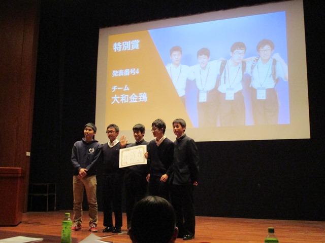 さて、本校チームであるが、Y1男子チーム「大和金鵄」は、スマートフォンを利用した健康管理アプリによって心臓突然死の予防を図ることを提案した。大学の先生方とも交渉し、食事メニューの管理や健康のためのアドバイスを行うアプリを実際に作成し、その利用効果やさらなる改善点も含めた堂々たる発表であった。中学生がここまでできることに審査員も驚いておられた。本人たちは上位を狙っていたのだが、残念ながら「審査員特別賞」の受賞になった。心臓突然死というテーマからやや外れたからだろうか……。もう一つのY3女子チーム「チームえだまめ」は、調剤薬局に狙いを絞り、幅広い年代にパンフレットの配布やおくすり手帳への啓発文貼付などで心臓突然死予防やAEDの使い方などを啓発するというものであった。実際に企業や薬局と交渉し、その効果も検証した上での発表であった。調剤薬局という発想を審査員も評価していた。