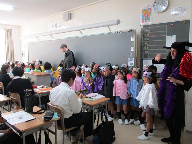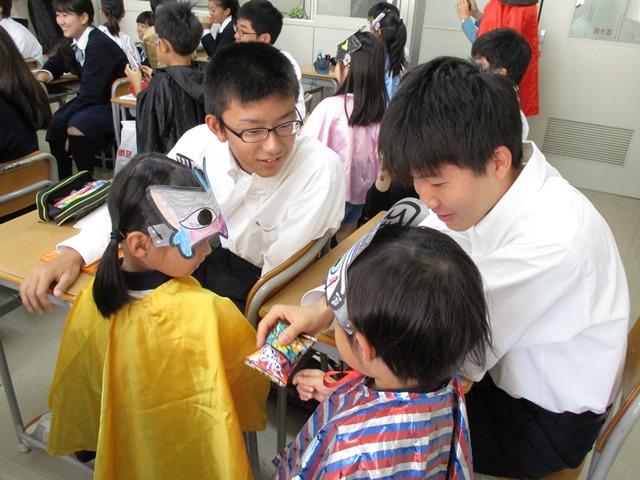 10月27日(木)の2限目、Y1(中3)生がPP3(幼稚園年長児)と恒例のハロウィン交流を行った。PP3生たちはマントにお面姿で、また先生方や英語担当の教員たちは悪魔や魔女に扮して、英語の授業が行われているY1B組にやって来た。女子生徒たちからは、「いやー、かわいい~」の声があがったが、男子生徒たちは照れくさそうで、何だか落ち着かない様子。それでも、普段の英語の授業の時よりは、華やいだ雰囲気を感じて嬉しそうである。