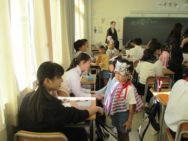 園児たちの目的は一つ。「Trick or Treat」と叫んで、お菓子を手に入れることである。Y1生たちの傍に来ておねだりをすると、用意していた”おにぎりせんべいハロウィンバージョン”をY1生たちが手渡してくれる。それをしっかりと握りしめて、「ありがとう」とお礼を言う園児たち。見ていると、男子も女子も、「こんな純粋な時もあったなあ」と昔を懐かしみ、今の自分を振り返っている様子で、”しみじみ”とした感じである。中には、園児たちを驚かせようと、包帯やトイレットペーパーを使ってミイラに化けてくれていた者もいたのだが、驚いても恐がってもくれない園児たちの反応に、逆に自分が落ち込んでしまっていたようだ。