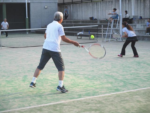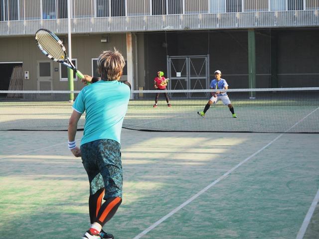 試合はすべてダブルス戦。経験等によって予め決められたペアが、「龍リング」「虎リング」の2つに分かれ、それぞれのリング内で2試合ずつの予選を行いました。強烈なサーブを繰り出す方、華麗なスマッシュを決める方、調子が悪いのか、ダブルフォールトを繰り返す方、力が入りすぎてコートをオーバーする球を打ってしまう方など、それぞれの力量に見合った珍プレー好プレーが4面のコートで展開されました。参加者の中には、喜寿を迎えたお祖父さまもいらっしゃいましたが、この方がなんと元気溌剌。軽やかなフットワークでコートを駆け回ります。ペアの方ともチームワーク良く、大いに活躍されていました。