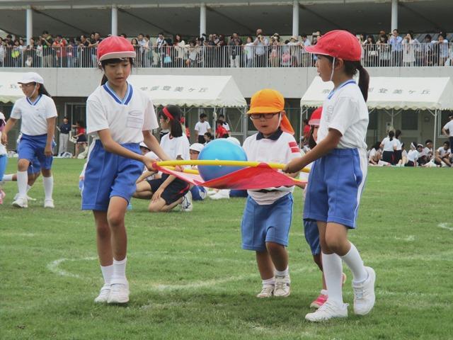まずは、異学齢交流競技の続きで、PP1・PP2・P4の「手をつないで レッツゴー」からです。小学校4年生が年少・年中の幼稚園児と交流します。園児2人・児童2人が組になって、手をつないでひもをジャンプし、フープに乗せたボールを落とさないように運ぶという競技です。”優しく、優しく”がポイントなのですが、園児の方が先に行ってしまうこともあり、P4のお兄さん・お姉さんが困ってしまう場面も見られました。年少・年中の園児はなかなか思い通りにはならないものだということを知ってくれたのではないでしょうか。