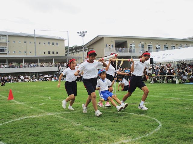 次は、P3・Y1の「おさるのかごや」です。毎年活躍する技術科の先生が作ったかごにP3生を乗せて、4人のY1生が落とさぬように運びます。4人の息やバランスと、乗っているP3生の呼吸が合わないとうまく運べません。四苦八苦しながらY1生たちは、おさるの帽子をかぶったお客さんを運び届けていました。