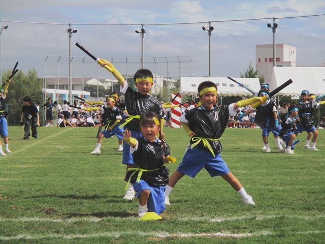 さて、表現演技に戻ると、先日の予行では体操服姿だったP1・P2生たちが、今日はカッコいい忍者姿になって登場。「にん!にん!~修行の途中でござるの巻~」の始まりです。持っている刀もきれいに磨かれています。単に衣装を着けただけではなく、踊りもパワーアップしていました。そして、決めのポーズもバッチリです。P1生・P2生がここまでできるとは驚きでした。