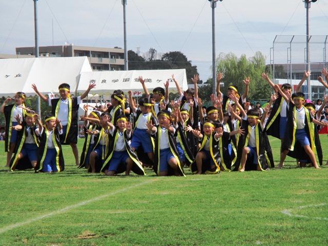 天候が心配されていましたが、ありがたいことに雨も降らず、天然芝も乾き、グラウンドは絶好のコンディションとなりました。この日に備えてギリギリまで練習を行ってきた子どもたちにとってはまさに天の恵みです。みんな晴れやかな顔で開会式に臨みました。全体演技の「奈良登美弾」の後には、応援団のエール交換が行われました。予行ではまとまりを欠いていたエールも、本番となるとよく声が出て、気合いも揃っていました。