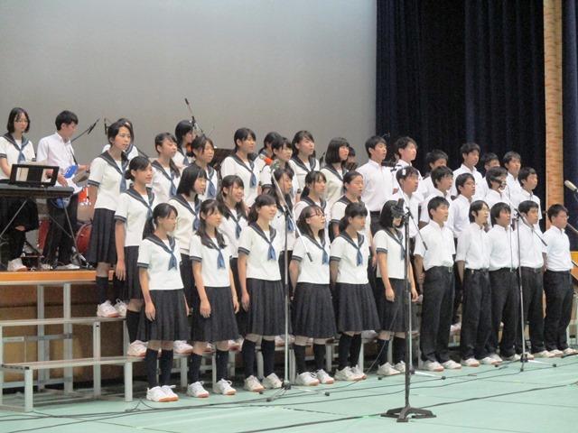 このコンクールの後は、M4生による「白浜研修プレゼンテーション」優秀作の発表とM3・M4の英語レシテーションコンテスト上位者の発表が続き、最後に、Y生音楽選択者による音楽発表がありました。さすがにY生ともなると、自分たちで楽器を演奏し、合唱の伴奏を行います。コンクール直後のM生たちに、ちょっと肩の力を抜いて、楽しく歌ってごらんと語りかけるような、さわやかな演奏・合唱でした。MとYがうまく溶け合った時間になりました。