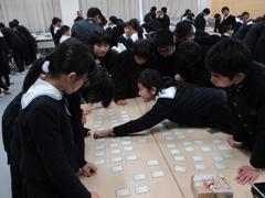 クラス予選であらかじめ達人チームから初心者チームまでが編成されていたようで、実力に応じたクラス対抗が行われた。札を並べる時には、各自自分のお気に入りがあるようで、それらを手元に置こうとして札を探しているところから、すでに戦いは始まっていた。いざ、歌が読み上げられると、皆真剣な表情になり、緊張感が漂う。カメラを構えている私が、先に下の句を声に出して言ってしまうと、ダメッと叱られてしまった。申し訳ない。