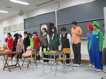 季節柄とは言え、ディケンズの「クリスマスキャロル」に挑むとはなかなか大したものだと期待を持って観劇させてもらった。大講義室という演劇をするには不便な会場にも関わらず、最小の装置で上手く舞台を展開させていること、それぞれの役柄がうまくはまっており、役の個性がきちんと出ていること、何よりストーリーを分かりやすく示せていることに感心した。8月の尚志祭の時にも上手になったなと思ったが、改めてここでも実感させてもらった。
