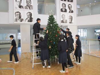 12月8日(火)、5日間の期末考査が終了し、生徒会役員及び有志諸君が、サイエンスホールに集まって、恒例のクリスマスツリーの設置を行ってくれた。
