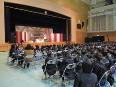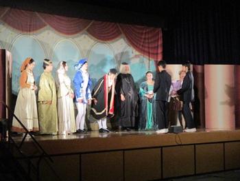 開幕後は、あっという間に舞台が中世の海港都市ヴェニスになります。役者の方々はやや大げさな演技でそれぞれの役どころを紹介しながら、ストーリーを進めていきます。友情あり、恋愛あり、正義と悪の対立ありと、原典の戯曲が小学生や中学生にも分かりやすいように工夫されています。滑稽な部分もあり、うまいものだなと感心しました。もちろん鑑賞しているM生たちも舞台に惹きつけられているようです。無事一件落着、パッピーエンドとなり、満足感が拍手となって会場に響きわたりました。