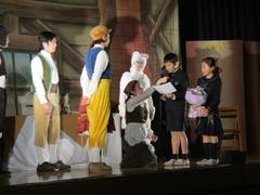 そして開幕。チルチルとミチルの登場だけでもう盛り上がっています。でも、さすがは学校公演に慣れた劇団の方々。子どもたちにとってはいつもの体育館の舞台を、どんどん不思議な夢の空間にしていきます。「想い出の国」「夜の御殿」「魔法の御殿」へと旅する二人の冒険が次々に展開されて、子どもたちはいつの間にか物語の世界に溶け込んでいきます。まるで自分が、お化けや悪者たちと戦っている気分です。舞台にこっそりと登場する青い鳥にもちゃんと目が届いています。あっという間の60分。一夜の夢から目を覚ましたチルチルとミチルが気づいた、”優しい家族に囲まれて「幸せだと感じる心」が「幸せの青い鳥」なんだ”というこの演劇の意味をきちんと理解できていたようでした。