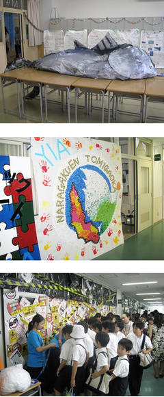 M4のフロアでは、宿泊研修で行った「白浜」が各クラスのテーマでした。近畿大学水産研究所にあったマグロの模型を再現したもの、その時に巡った研修地のジオラマ、教室一面にテープの線路を描いての白浜電鉄すごろくなど、オモシロ真面目な展示が行われていました。