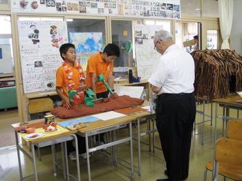さらに進んで、M2のフロアでは、2月に実施した「ハワイ宿泊学習」のまとめが行われていました。「歴史」「文化」「自然」とクラスでテーマを決め、工夫を凝らした展示が行われていました。来校した理事長先生の前でタロイモやコナコーヒーのことを一生懸命に語る児童の様子に好感が持てました。