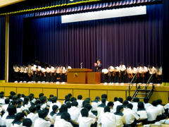 このMY終業式では、それぞれの式の最後に、生徒会が主催して夏の大きな大会に挑む児童や生徒の壮行会が行われた。Y課程ではテニスの近畿中学校大会出場者、全国高校ディベート選手権出場者(弁論部)、全国高校総合文化祭小倉百人一首かるた部門出場者(大会出場中)への激励の言葉が贈られた。また、M課程では、西日本私立小学校連合会の水泳記録会に出場するメンバー25名の壮行会を行った。それぞれの活躍を期待したい。