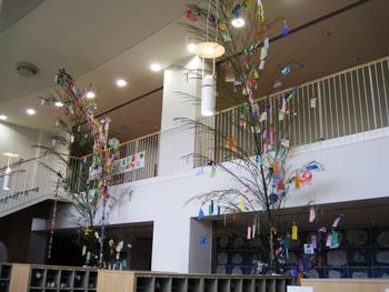 さて、七夕と言えば、恒例の七夕飾りです。毎年小学校の先生方が中心となって、提供くださる方の所へ行って竹を切り出し、そこにたくさんの飾りを施し、子どもたちが書いた短冊を結びつけます。P棟では、昇降口に2本の竹が立てられました。七夕飾りには付きものの「輪っか飾り」や「網飾り」もちゃんと吊るされています。