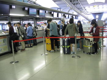 さて、出発当日の関空の様子である。朝早くに全員無事に集合したのだが、ツーリストの情報では、この日は朝から大変な出国ラッシュとのこと。日本人の出国に加えて、アジア各国からの旅行者が帰国する日時に当たったようで、とにかく急いで手続きをしないと間に合わないかもしれないと急かされる。出発式もそこそこに国際線の受付カウンターに向かう。