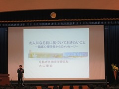 今回は、京都大学大学院 教育学研究科 心理学臨床講座 准教授の大山泰宏先生を迎え、「大人になる前に気づいておきたいこと:臨床心理学者からのメッセージ」というテーマで講演いただいた。「知能と記憶力、そして感受性が最も優れている中高生世代は、最も不安定になりやすい年齢でもある。生(性)・老・病・死といった人生の最も困難なテーマについて考える時期であるのに、それらのことについてまともに向き合い話し合ってくれる大人は少ない。ネット上でそれらが語られることはあっても、限られた興味や視野の中でのコミュニケーションであり、実際に他者と向かい合うことは難しい。直面しているテーマを知ること、他者と話し合い共有できること、大人になった時に子どもたちを温かいまなざしで見ることができるかを考えることが、君たちが今を生きるために必要だ」と大山先生は語られた。