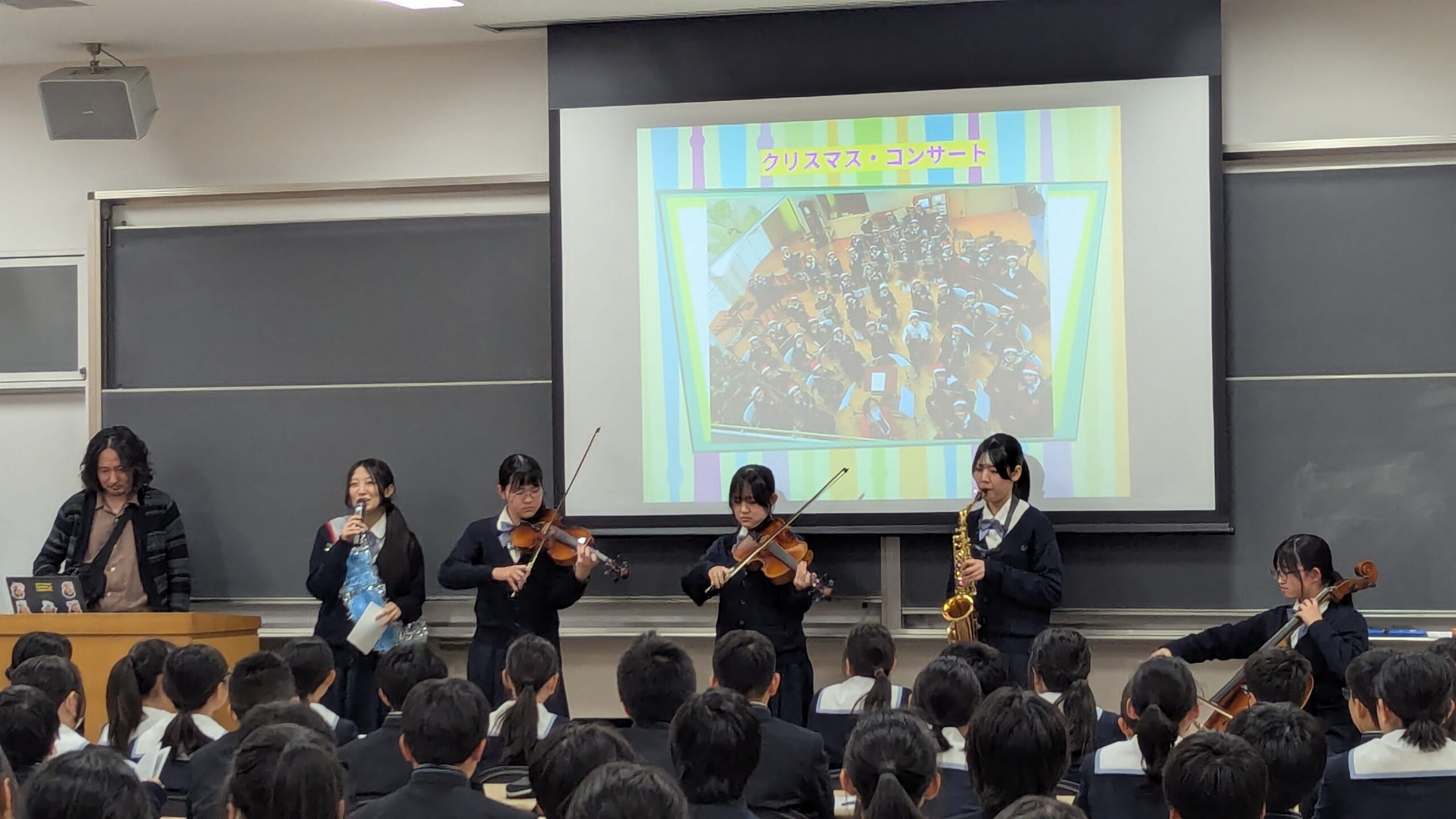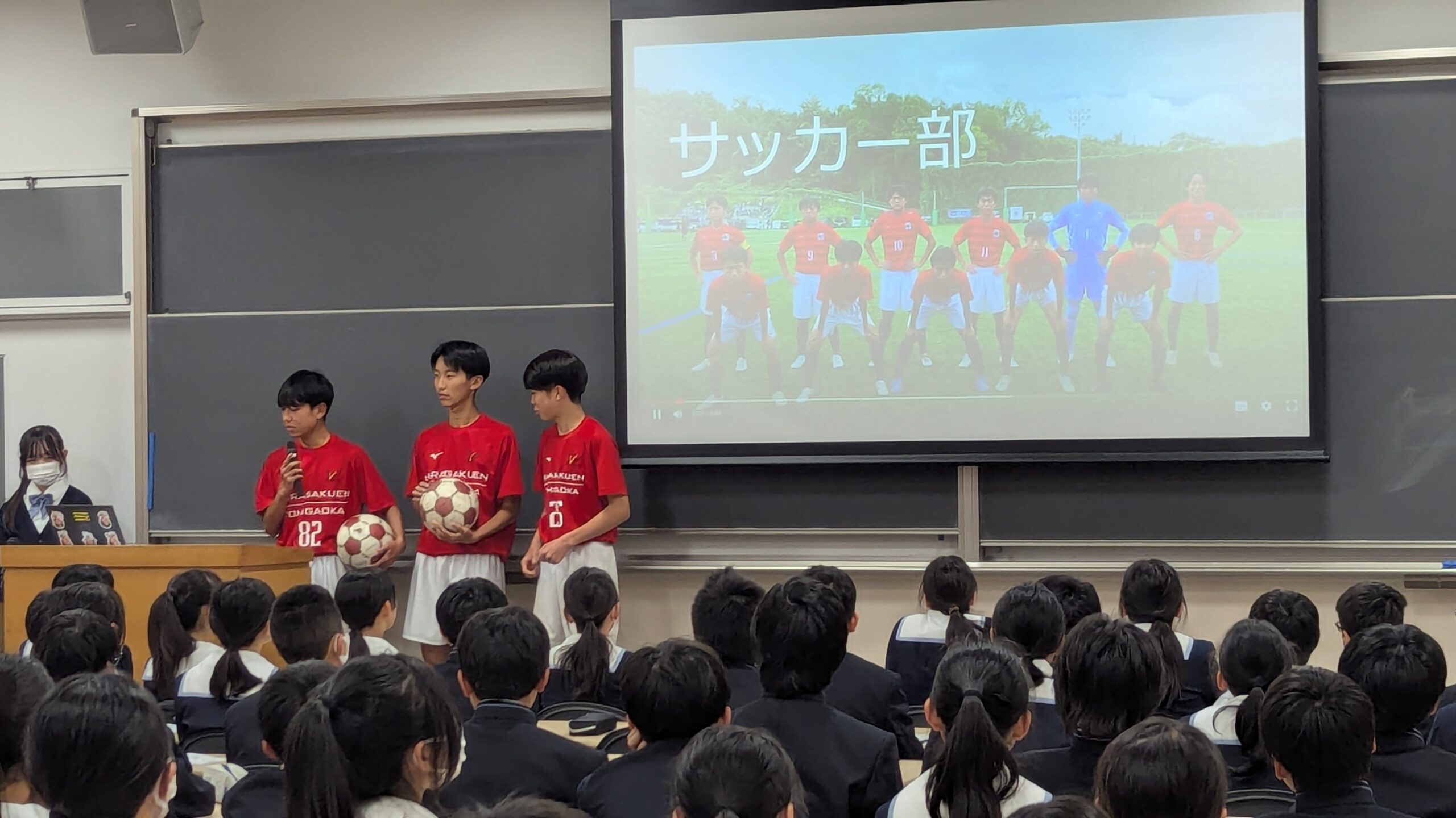 M3生(中1)に部活動の体験入部を前にして、クラブオリエンテーションを開催しました。先輩たちが、活動内容、部のアピールポイント、これまでの実績などをプレゼンシートにまとめ、実演なども交えながら丁寧に説明してくれました。