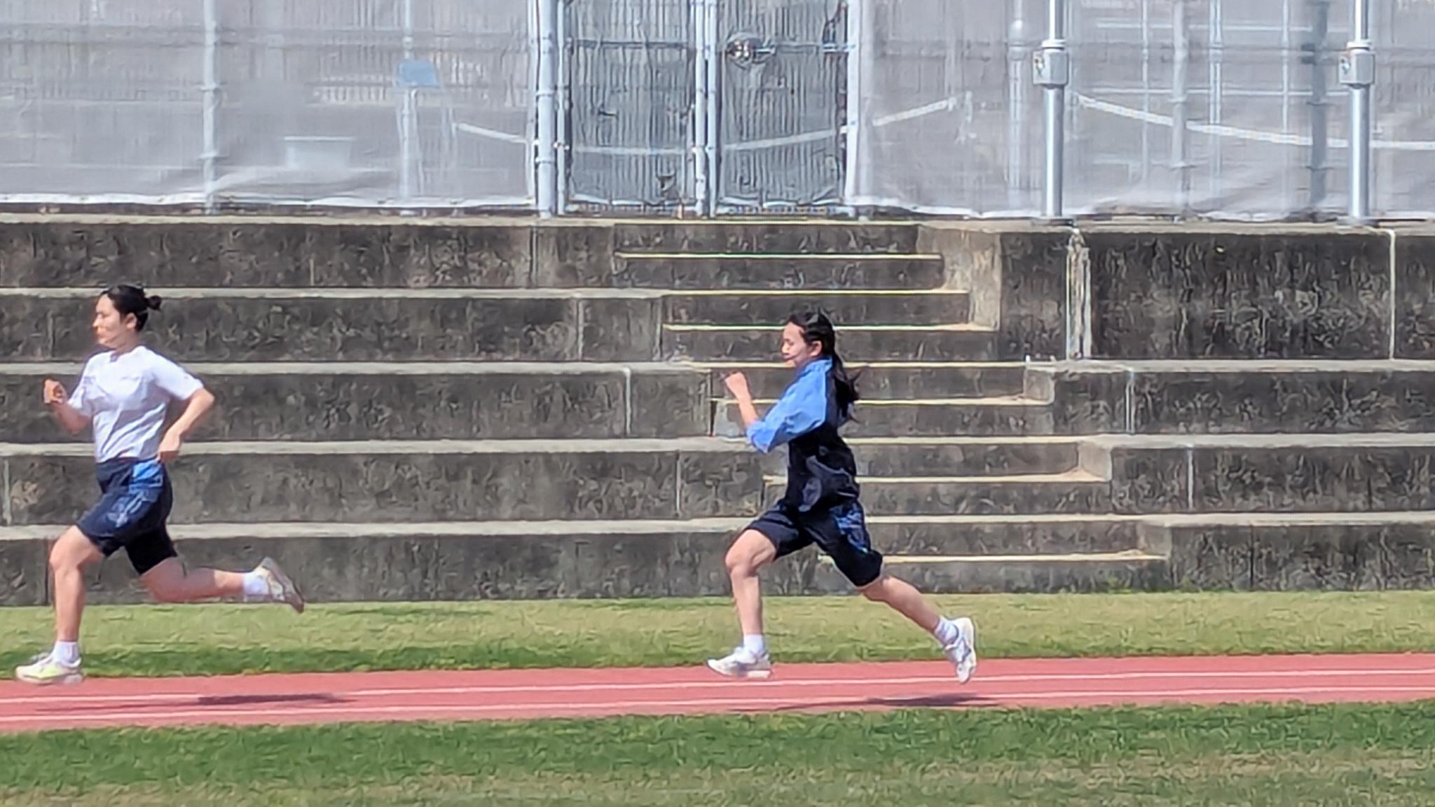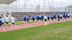 晴天の下、若い力を目いっぱい発揮して、記録の更新に挑む姿は、本当に素晴らしいと感じます。持久走のゴール後に倒れこんだ生徒から、「体力の限界です。エネルギーをください!」とのリクエストに応えて、校長もグラウンドで生徒たちに“奈良登美ファイティングスピリッツ”を注入させていただきました。