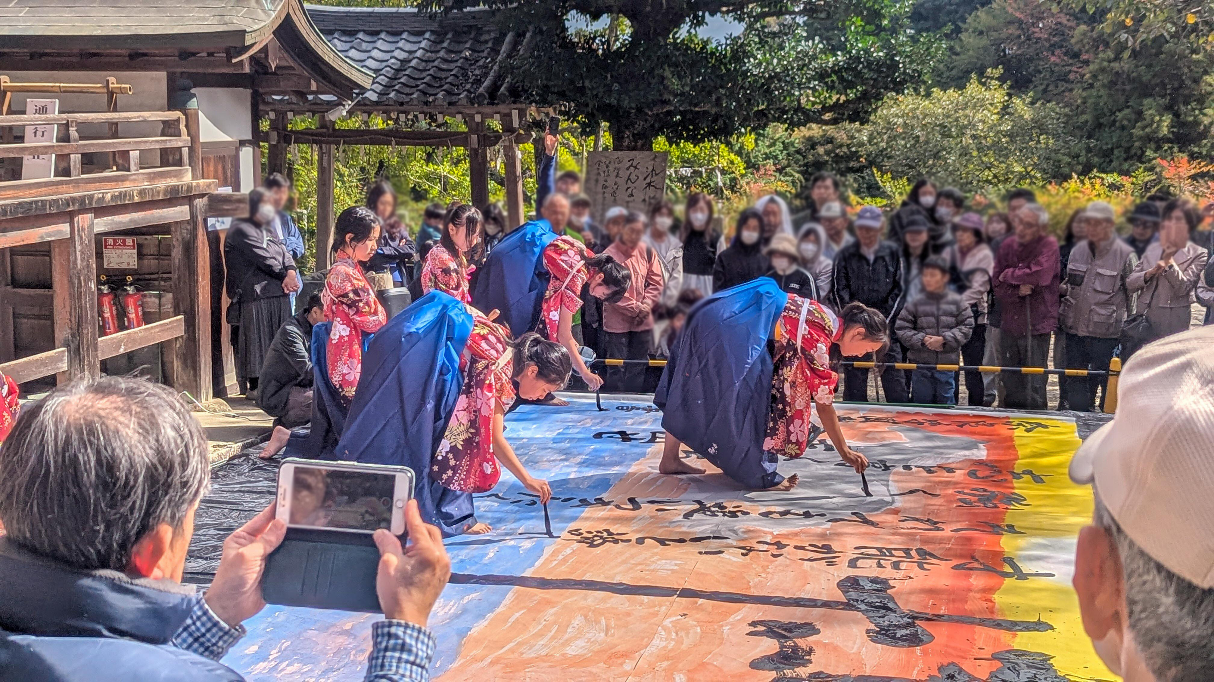 11月3日(月)、松尾寺の1年に1回だけの秘仏厄除観音特別開扉の日に合わせて、書道部が境内で書道パフォーマンスを披露させていただきました。早朝に小雨が降り、少し天気が心配でしたが、開始時刻までには雨も上がり晴れ間も見える中でのパフォーマンスとなりました。