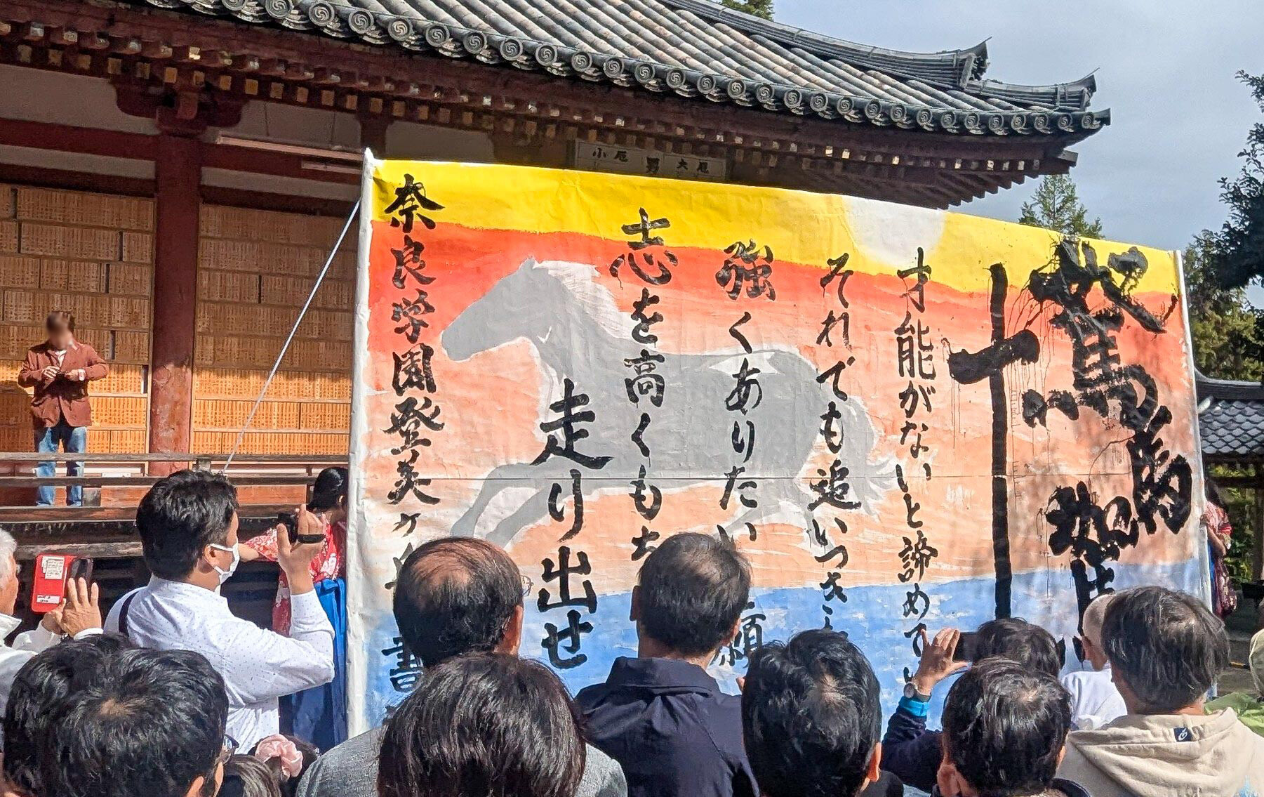 来年の干支である「馬」をテーマに、大文字で「駑馬十駕」と書き上げ、「才能がないと諦めていた それでも追いつきたくて 強くありたいと願った 志を高くもち 走り出せ」と揮毫しました。同時に開催されていた書道展を見に来られた方や、秘仏厄除観音特別開扉に拝観に来られた方からも大きな拍手をいただきました。保護者の皆様も応援に駆けつけていただき、ありがとうございました。