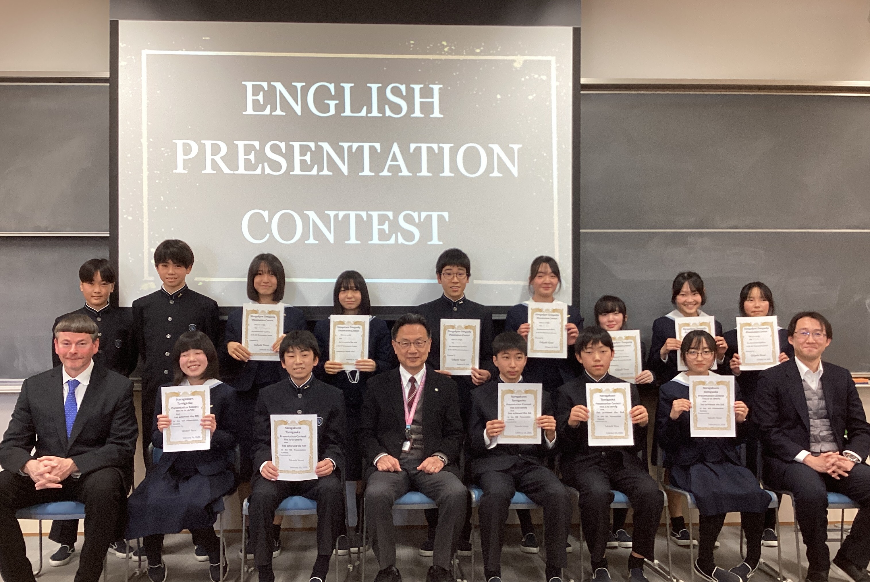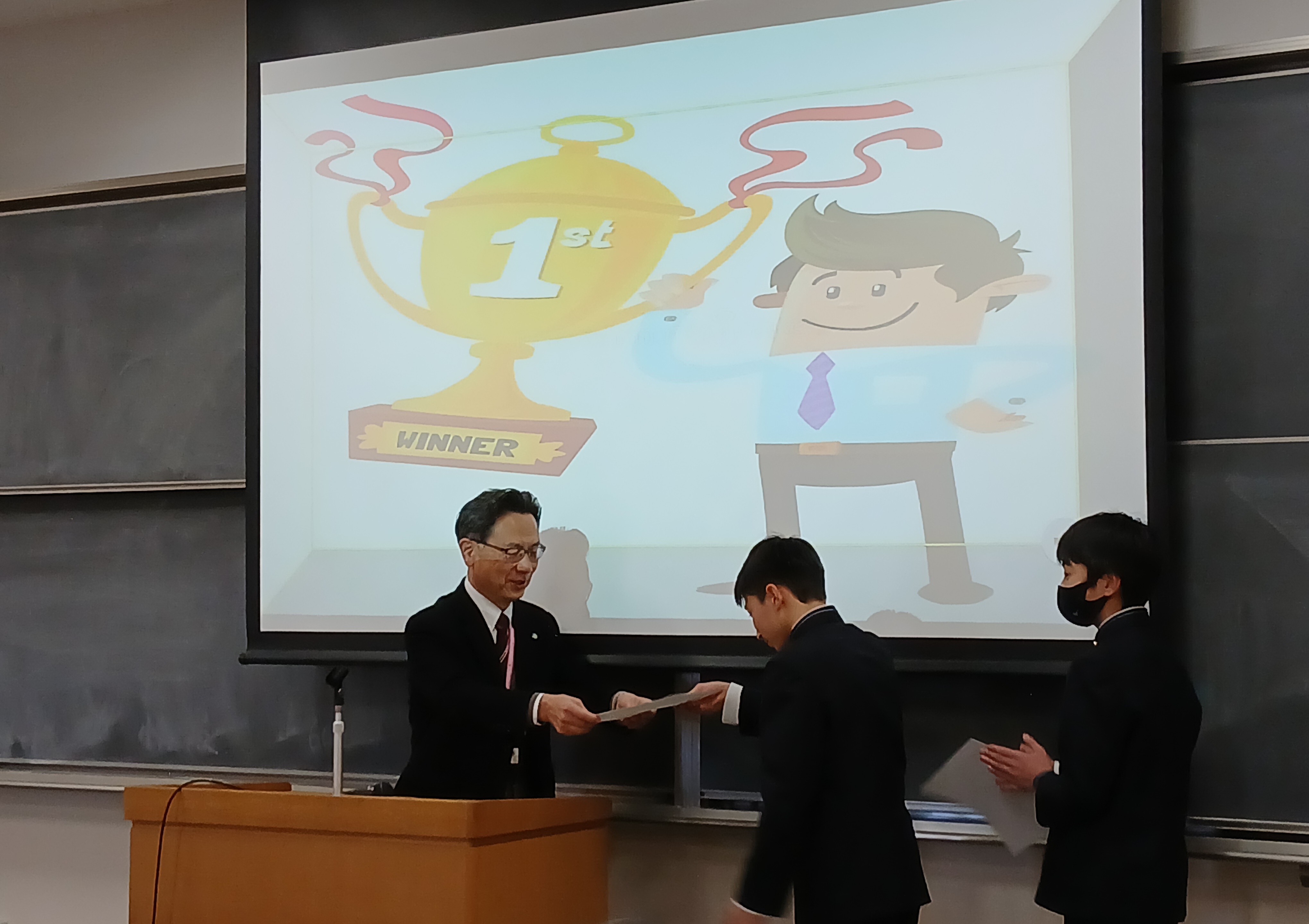 各クラスの代表者12名が、身振り手振りを使い、表情豊かに、堂々と発表を行ってくれました。本当に中1生かと思うほど、発音、語彙力、表現力、暗記力などの観点で、全ての発表が素晴らしく、躍動感があり、印象に残るものばかりでした。伝えたい、分かってほしいと思う内容をしっかりと持つことが、コミュニケーション力を向上させるのだと改めて感じるプレゼンだったと思います。