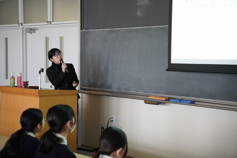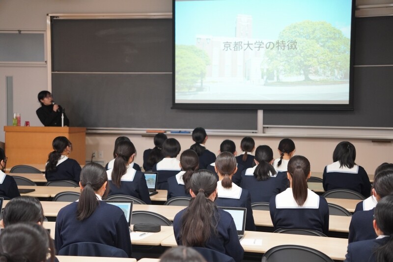 2月18日(火)、「京都大学女子高生応援大使による講演会」を開催しました。この講演会は、京都大学に在学中の本校卒業生が、京都大学の魅力や大学生としての生活、大学受験に向けての学習方法などをアドバイスすることで、後輩である本校生徒が進路を考える上での手助けになることを目的としたものです。