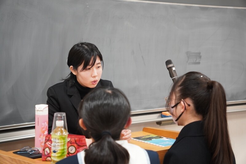 事前に申し込みをした生徒に対し、京都大学の良さ・楽しさのほか、自身の中学・高校時代の勉強方法や考え方、身体面・精神面での受験勉強への向き合い方など、お話しは多岐にわたりました。年齢が近く、かつ同性の先輩のアドバイスを生徒たちは真剣に聞き入り、一部の生徒は全体の講演会終了後も質問に行っていました。