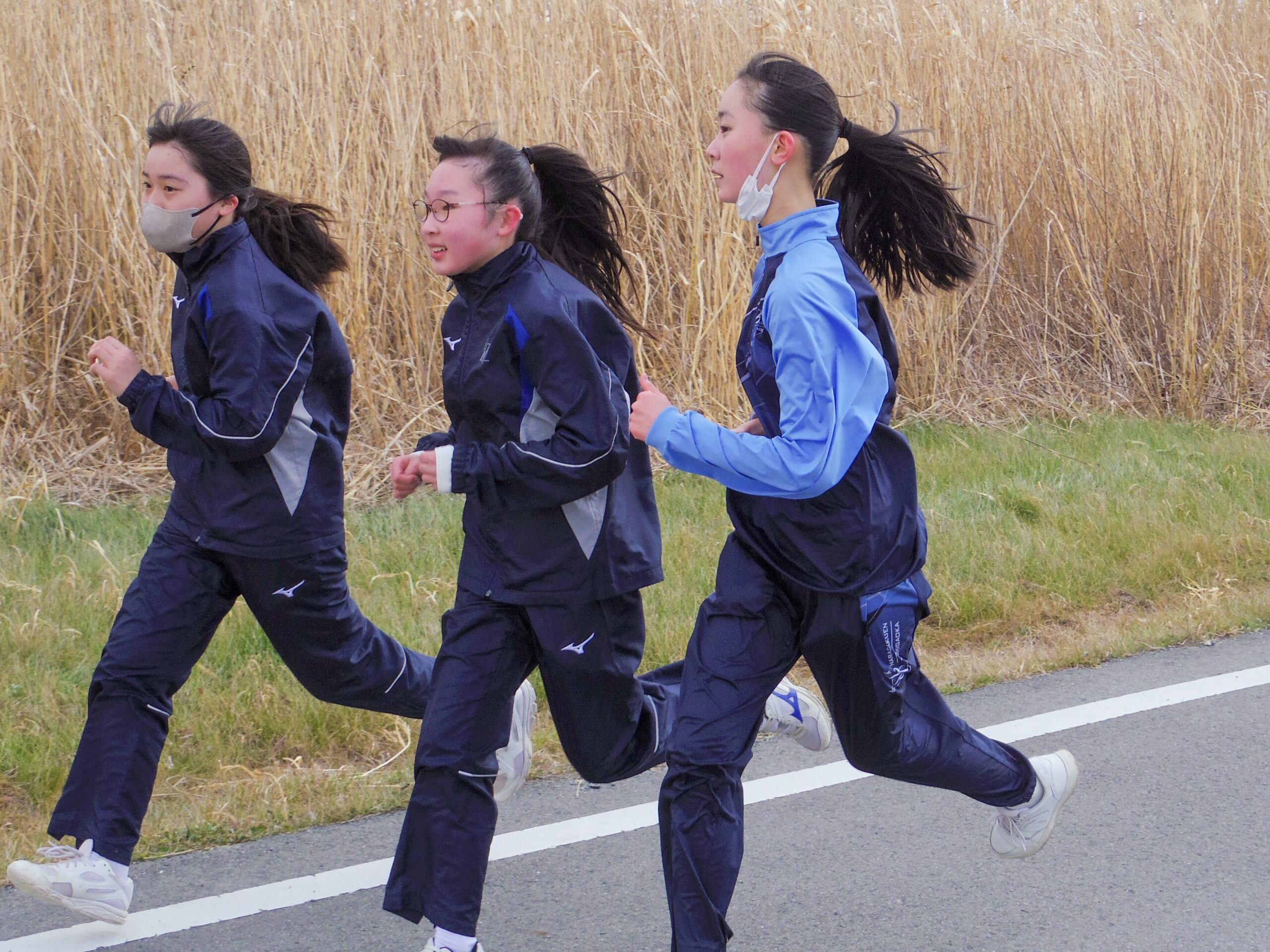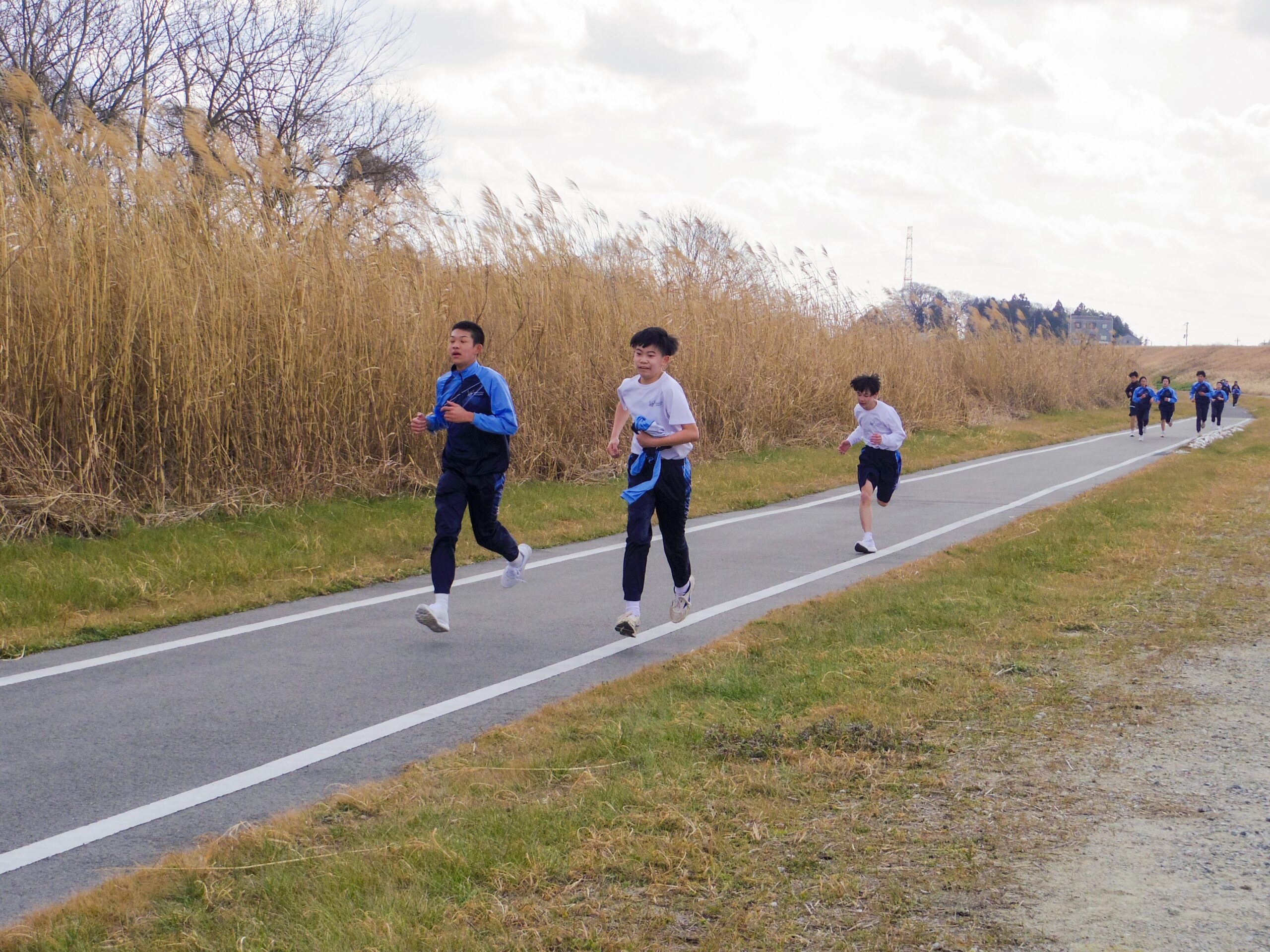 準備体操で身体をほぐしたあと、クラスごとにスタートしました。Y生もM生も強風の中、最後まで一生懸命走りきっていました。先に走り終えた生徒たちは戻ってきた同級生に「ラスト!ファイト!」などと声をかけ、励まされた生徒がラストスパートをかける姿が印象的でした。教員も拍手や声援とともにゴールで出迎えました。