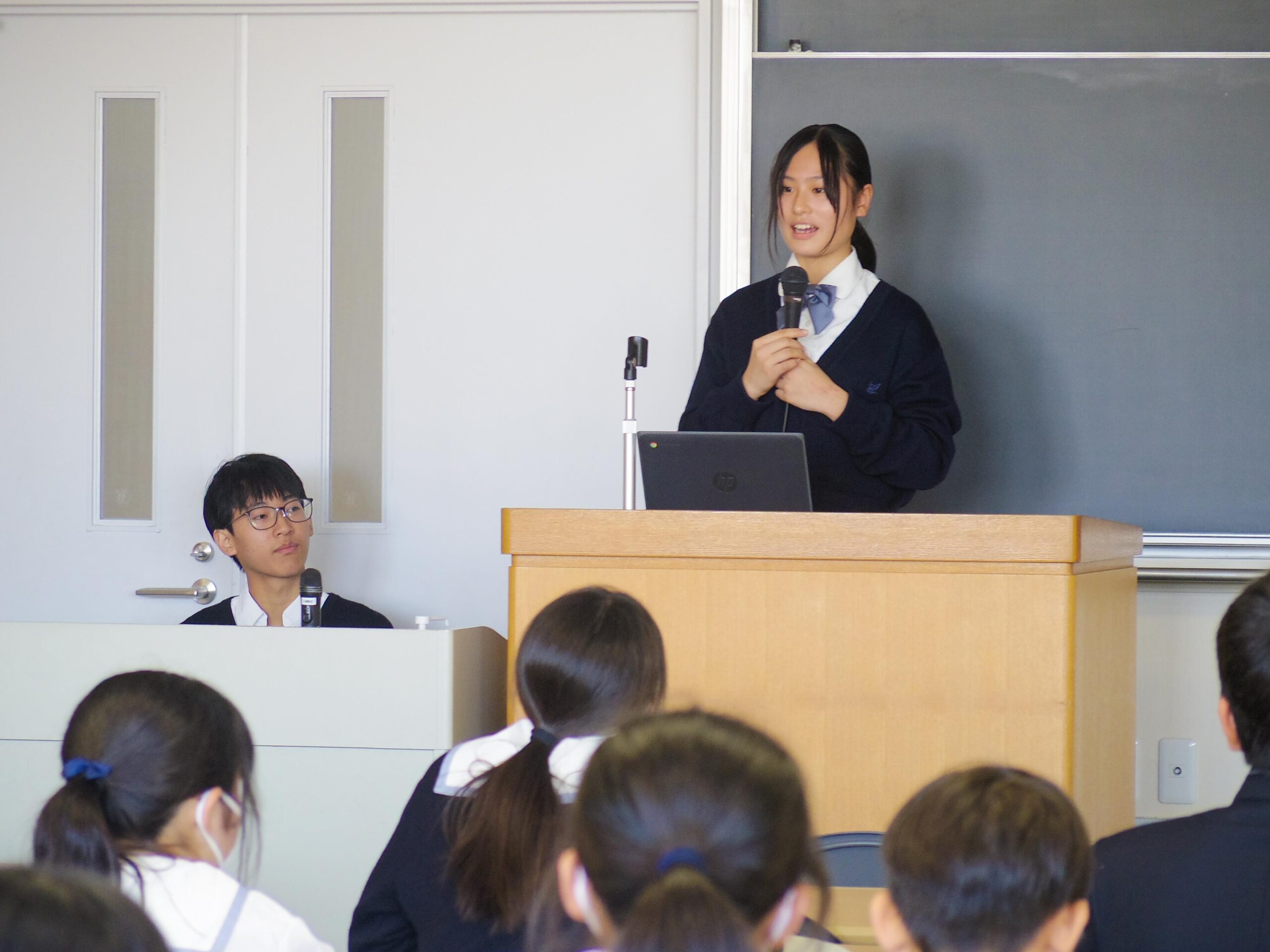 発表後の質疑応答では、代表生徒がさまざまな質問に答えました。「中学校生活で楽しいことはなんですか」という質問に対し、生徒は「尚志祭や運動会などでは運営としてかかわる機会も多くなり、楽しむ側から楽しませる側になる」と答えるなど、経験を交えて伝えていました。
