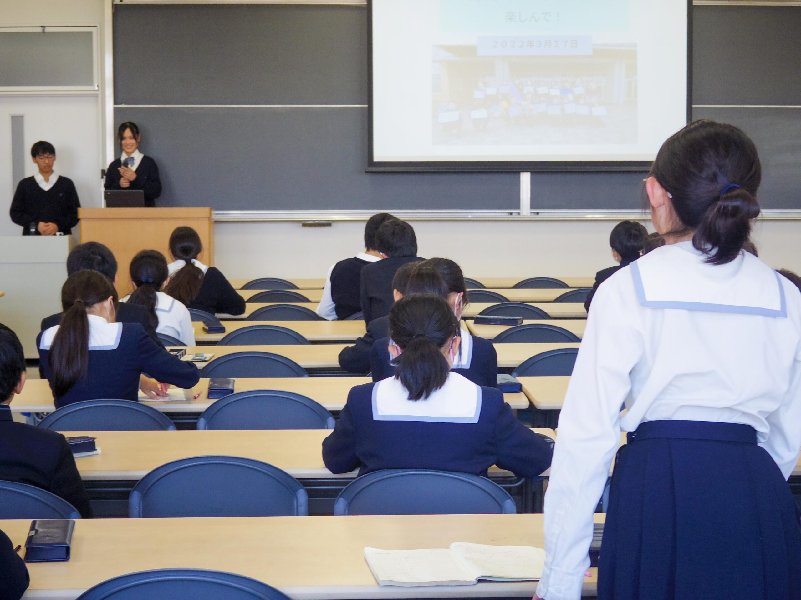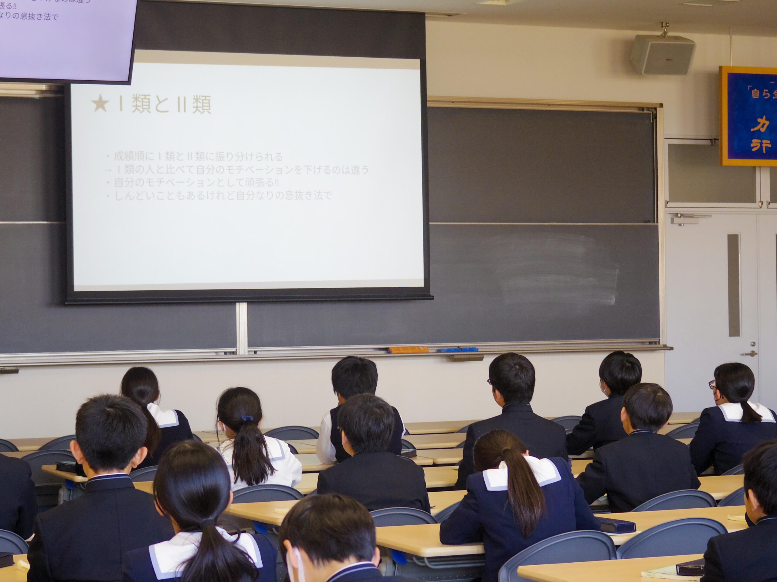 Yl生は代表生徒2名がスライドを使って、自身の経験をもとに学習面で変わることのほか、部活動や学校行事でのやりがいなどについて語りました。特に入試を控えているM2生に向けては、復習のポイントや教材についてもアドバイスをしました。