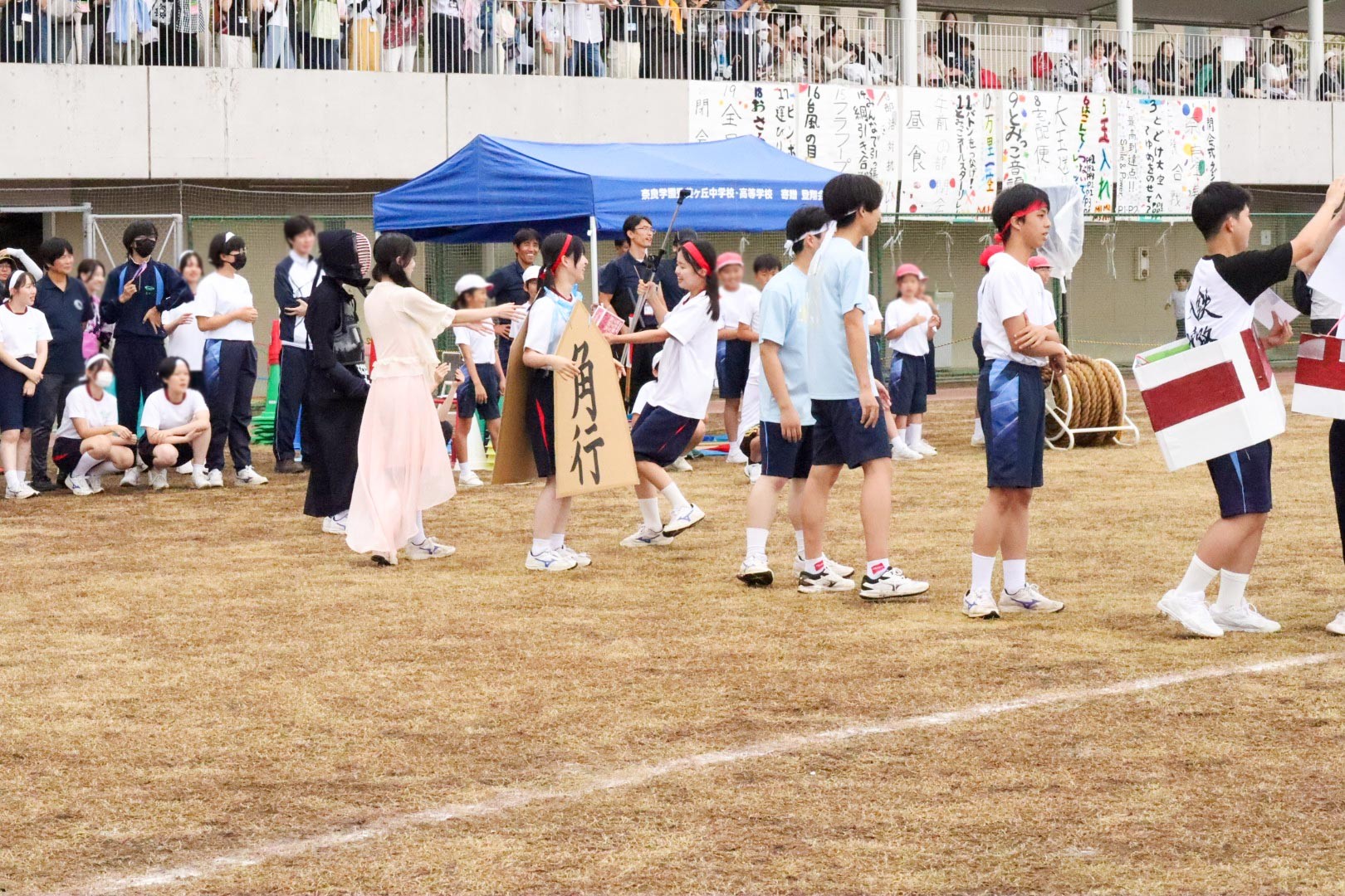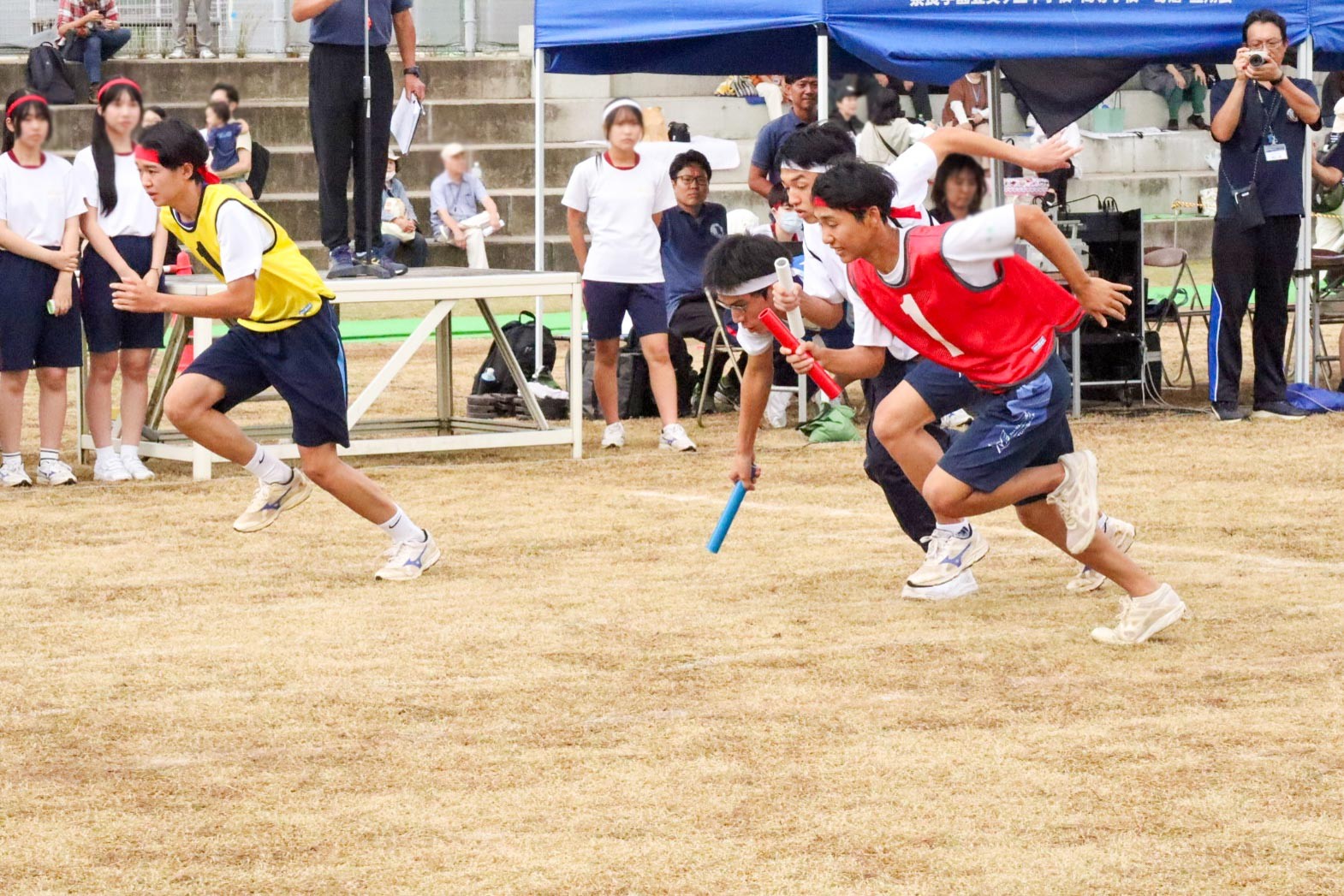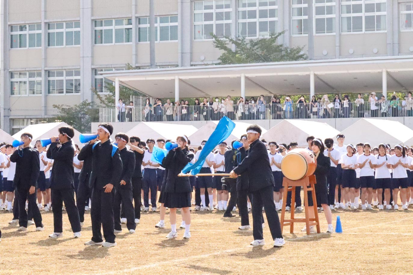 午後の部の最初に行われた「部活対抗リレー」は、運動部や文化部がそれぞれユニフォームを着たり、道具を抱えたり、工夫をこらした姿で懸命にバトンを繋ぐ姿に、応援する保護者の皆様からも和やかな笑い声が溢れていました。