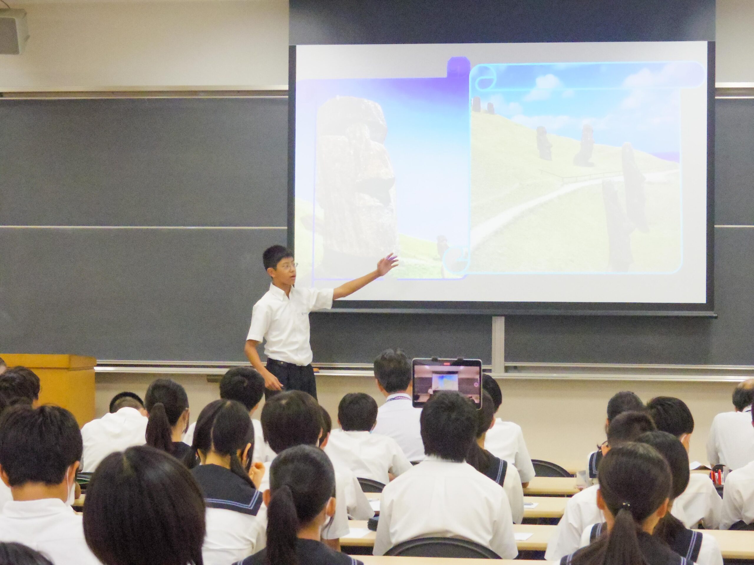9月26日(木)、本校にてM4学年(中学2年生)による英語プレゼンテーションコンテストが行われました。各クラスの予選を勝ち抜いた代表生徒11名が、世界各国の世界遺産をテーマに、それぞれの発表を行いました。