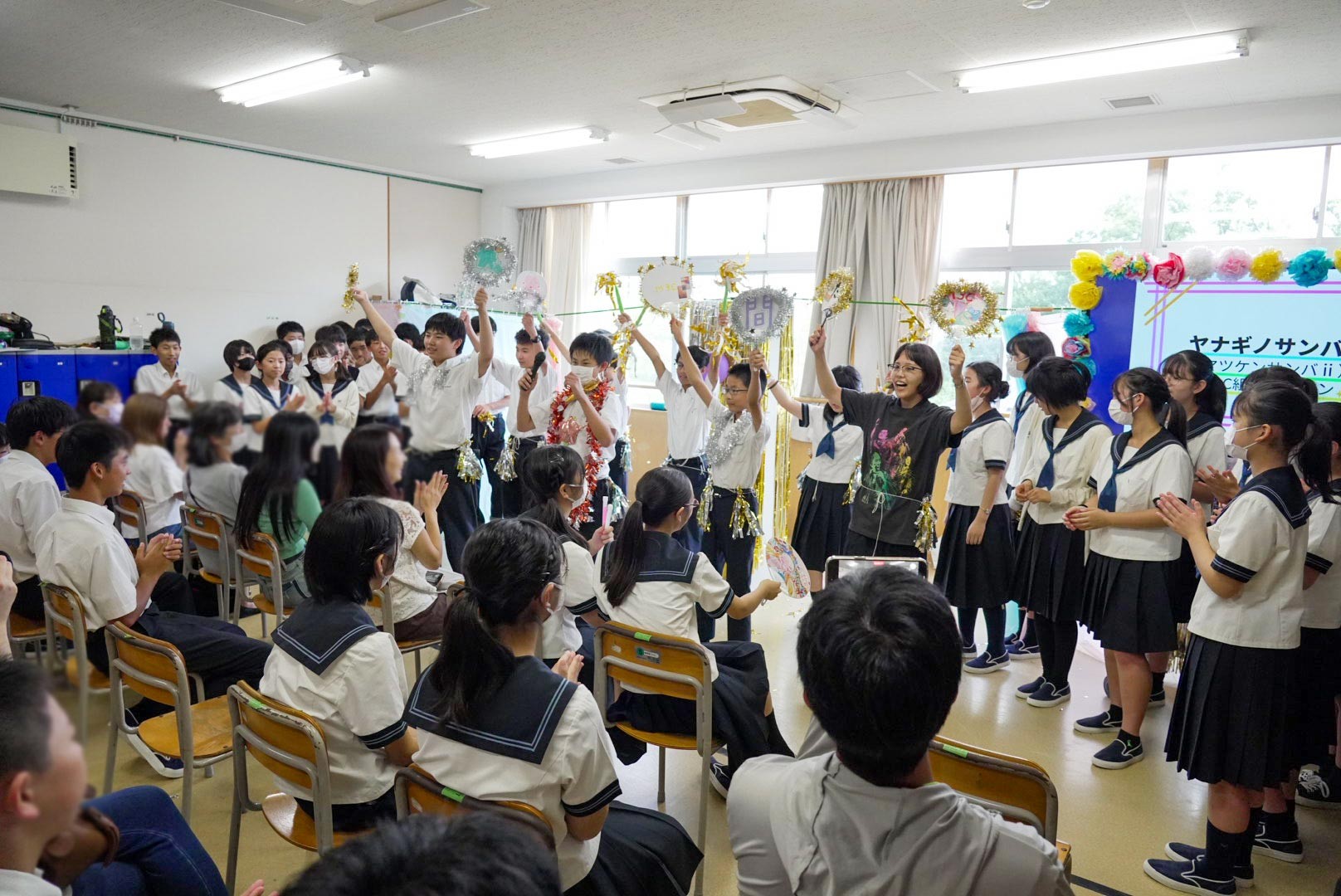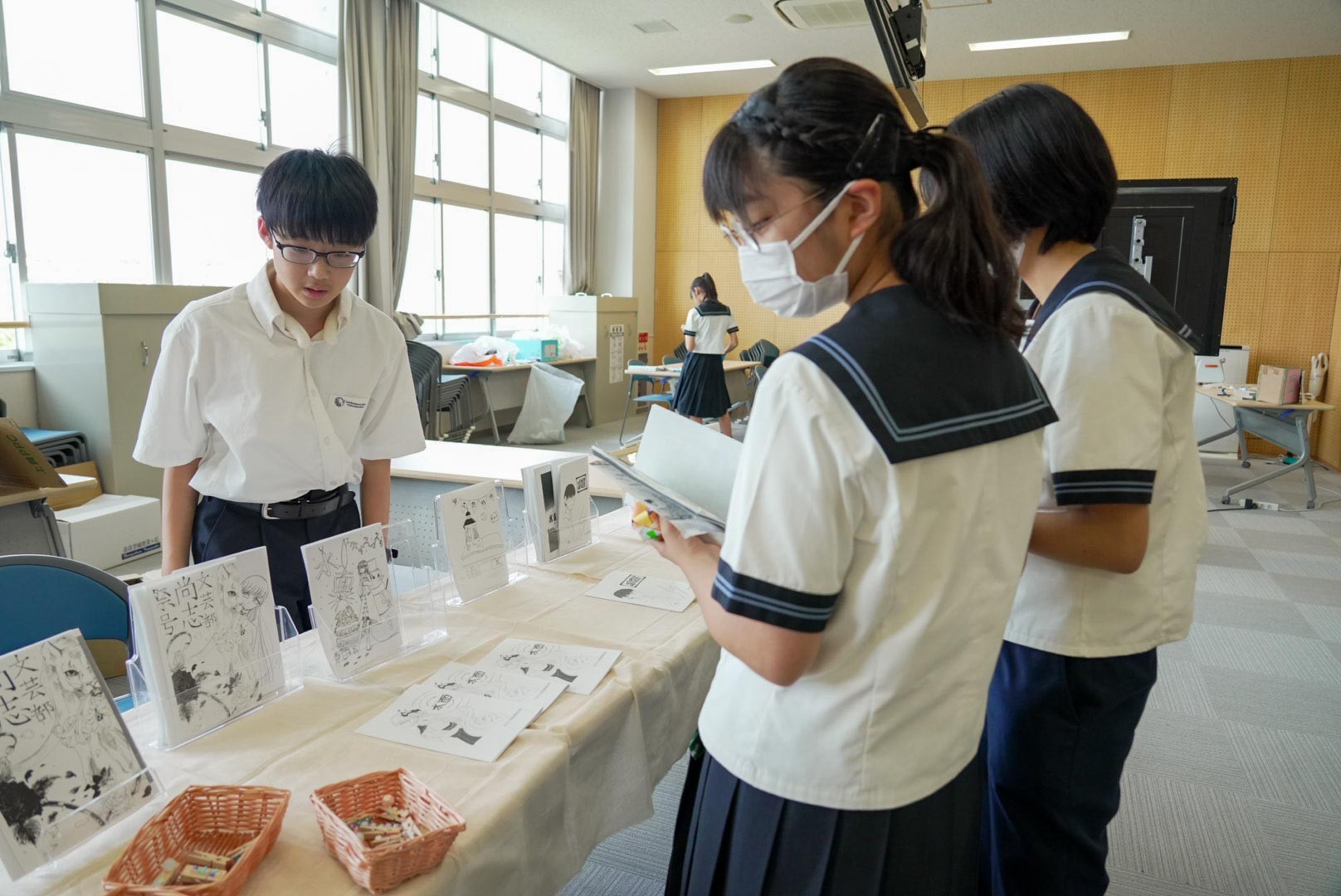 M4(中2)は、白浜宿泊研修をテーマにプレゼン発表とクラス企画が行われました。プレゼン発表では、グループごとに様々なテーマに関する探究学習の成果が報告されました。また、クラス企画では、各クラスが創意工夫を凝らし、来場者を楽しませていました。
