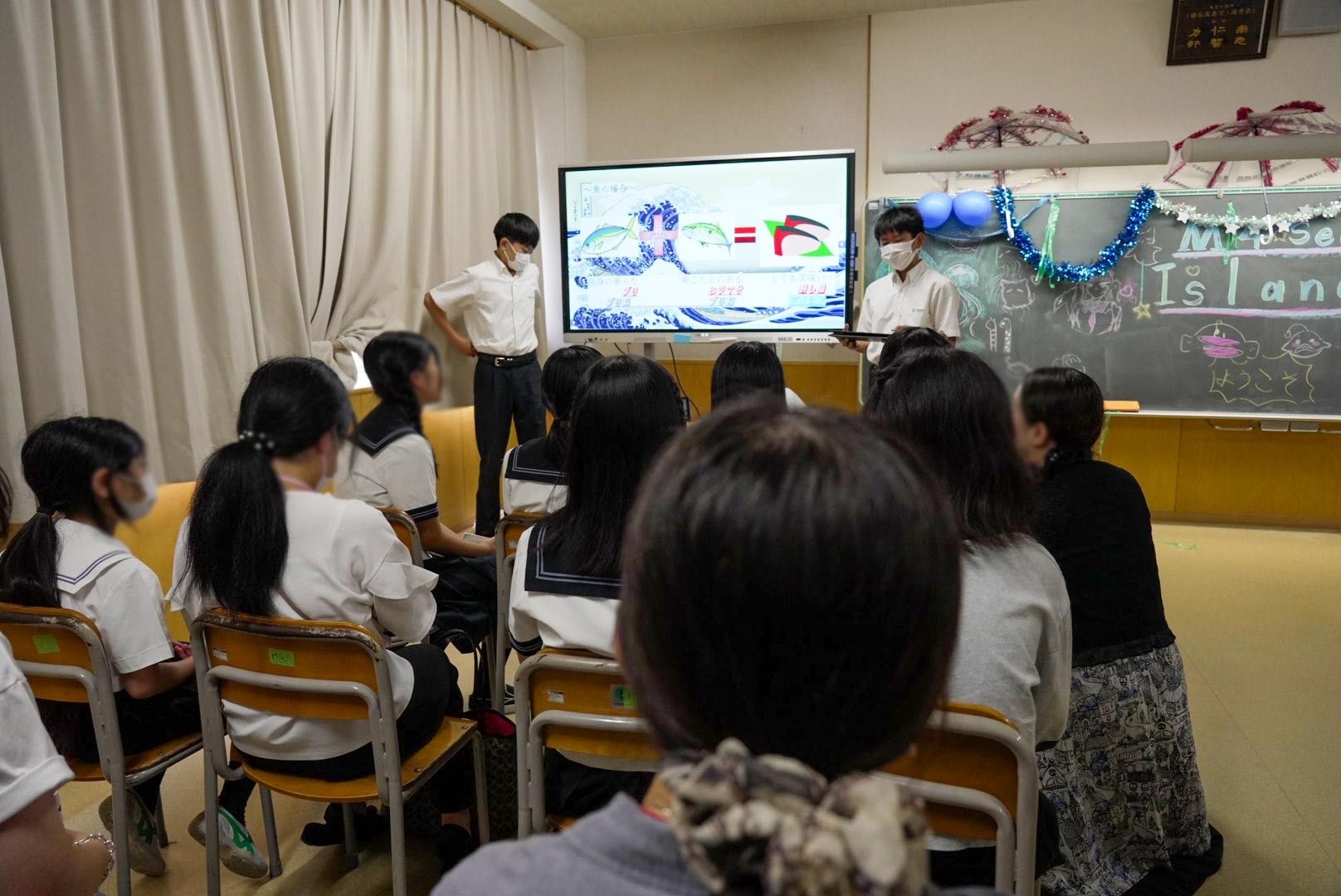 演劇部では、「カモメに飛ぶことを教えた猫」というお芝居が上演されました。部員たち自身で作った衣装、大道具、小道具で、MY体育館の舞台が川や空など様々な場所に早変わり。たくさんの動物たちをそれぞれに演じていました。