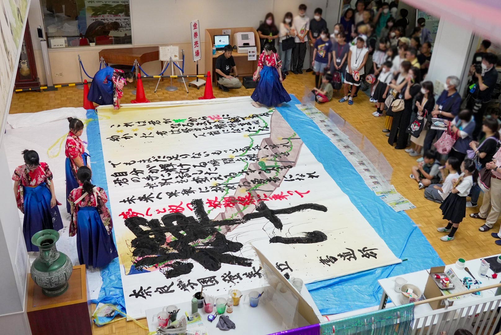 また、サイエンスホールでは書道部によるライブパフォーマンスが大盛況。音楽に合わせて書を書き、最後には特大の筆で「蓮」という字を書いて完成させました。