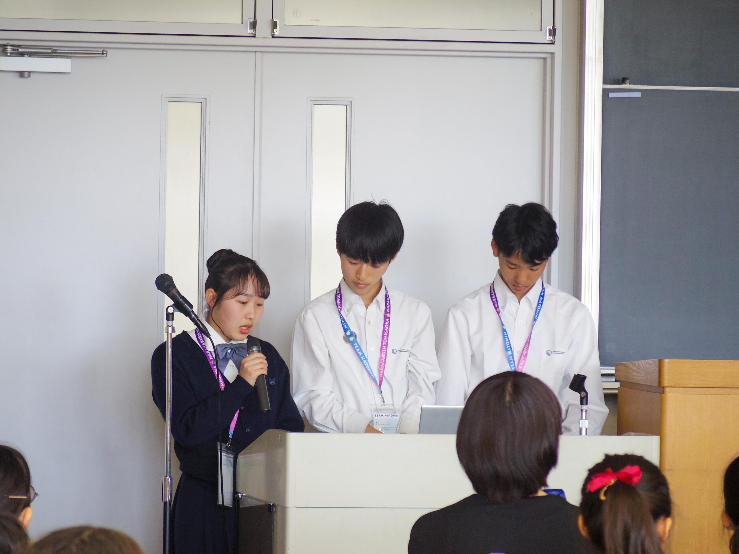 はじめに、安井校長があいさつを行い、「伸び率日本一の学校」を目指すための取り組みについて説明しました。続いて、高校2年生3名がスライドを用いて学校生活について紹介しました。学校設備や給食のほか、各学年で行われる宿泊研修や、オーストラリア語学研修・ターム留学などの海外学習についてもスライドを用いて説明しました。