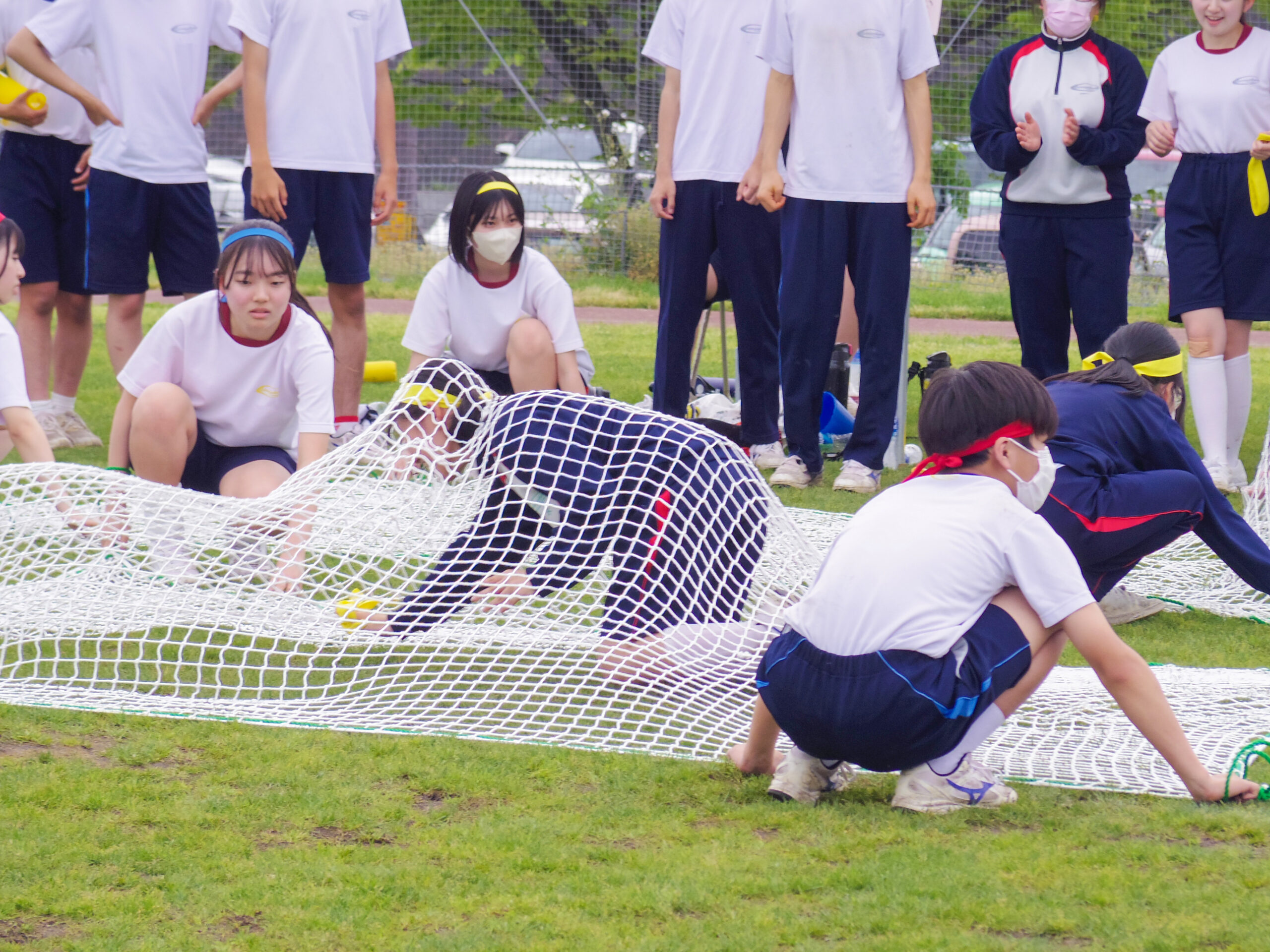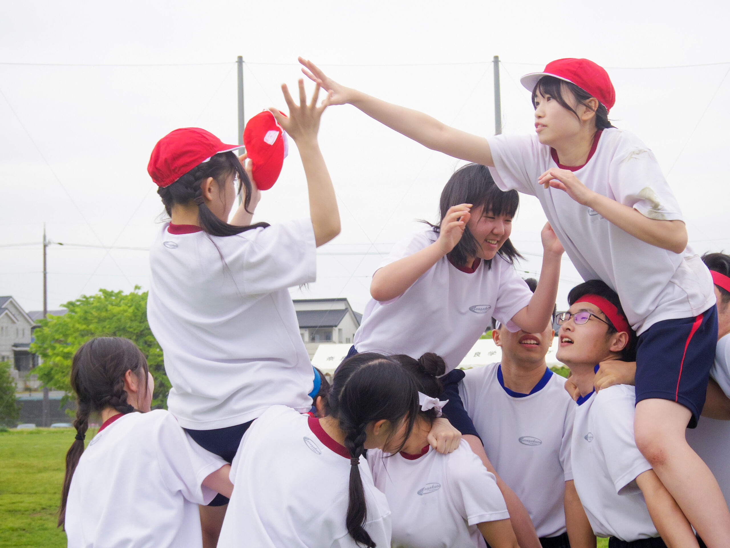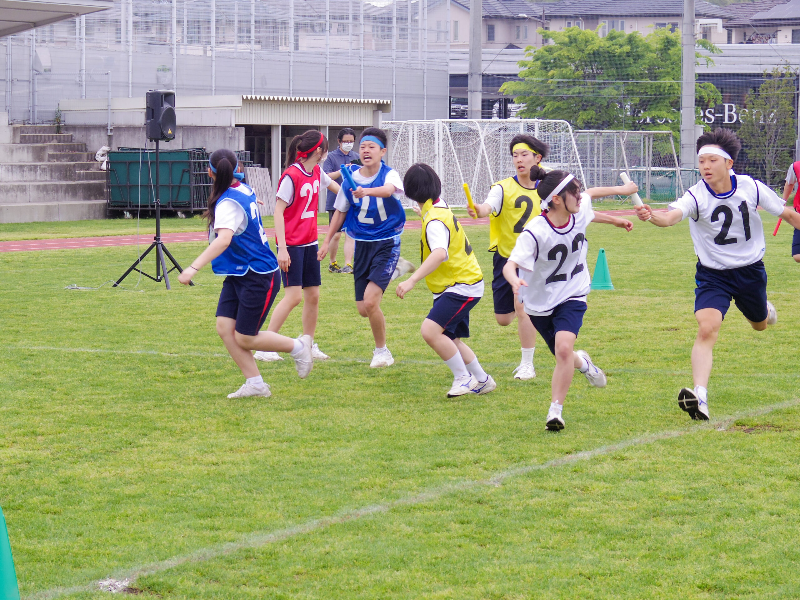 昼休憩後の「団結の時」では、赤・青・黄・白の団別に歌や円陣で結束を高め、午後の競技に備えました。順位が何度も入れ替わる大接戦となる競技が多く、生徒たちの応援も熱が入りました。最後は全学年がたすきをつなぐ色別対抗リレーで締めくくりました。