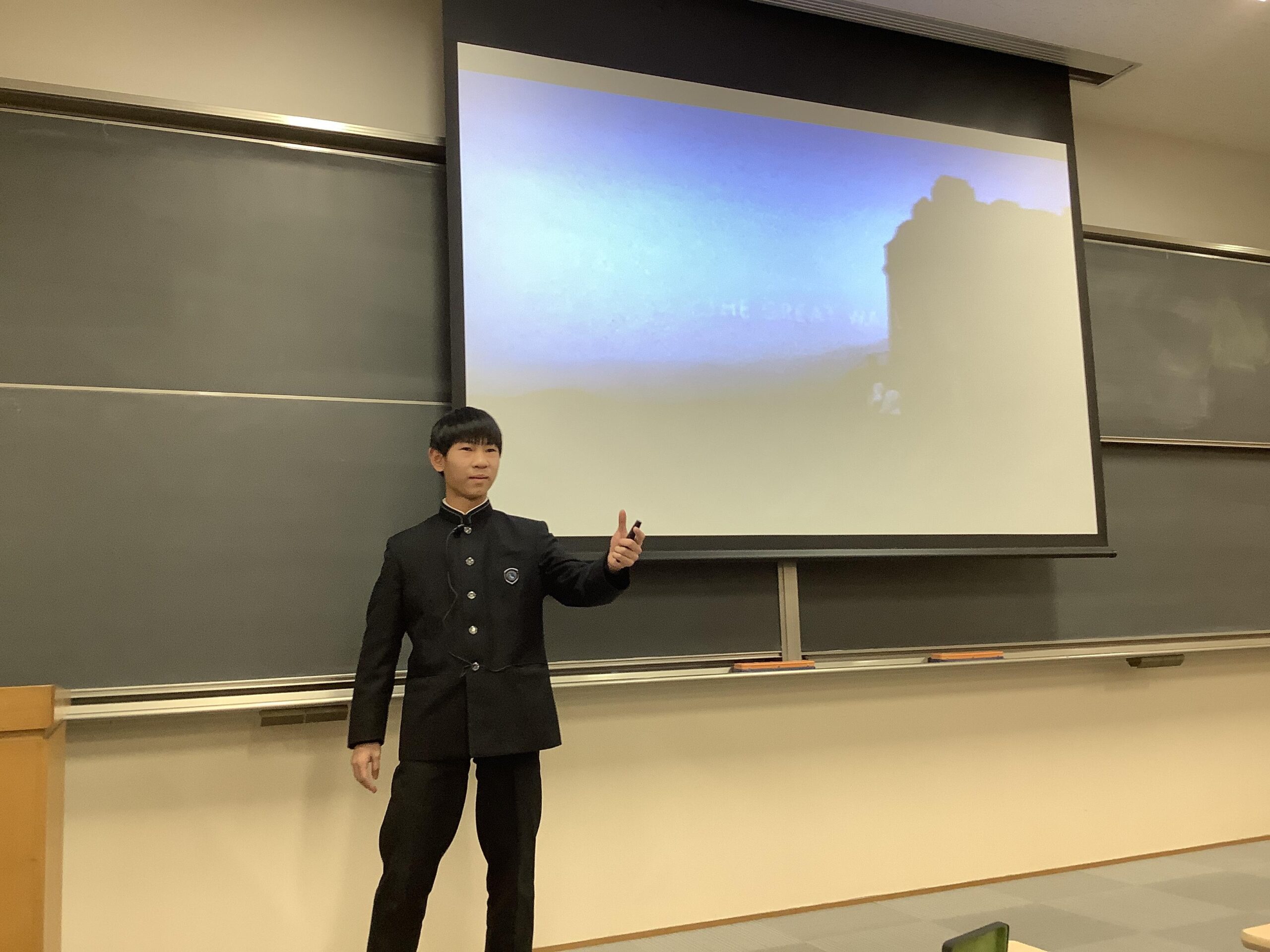 英語とEC(英会話)の授業内で、1学期には「世界遺産」、2学期には「世界のお祭り」について調べ、ChromeBookでスライドを作成し、スピーチの原稿を書き、クラス内で発表を行い、代表生徒を選びました。