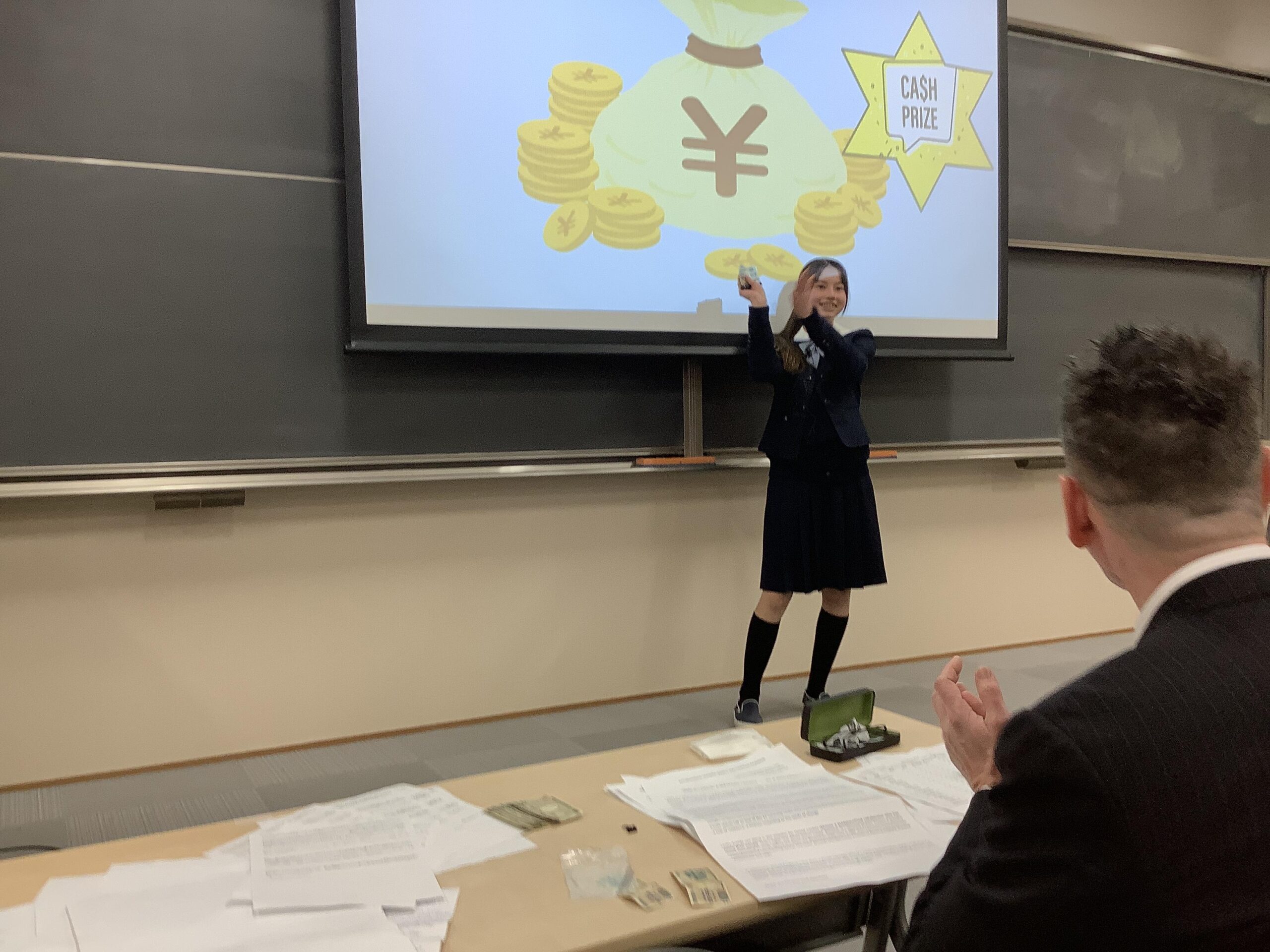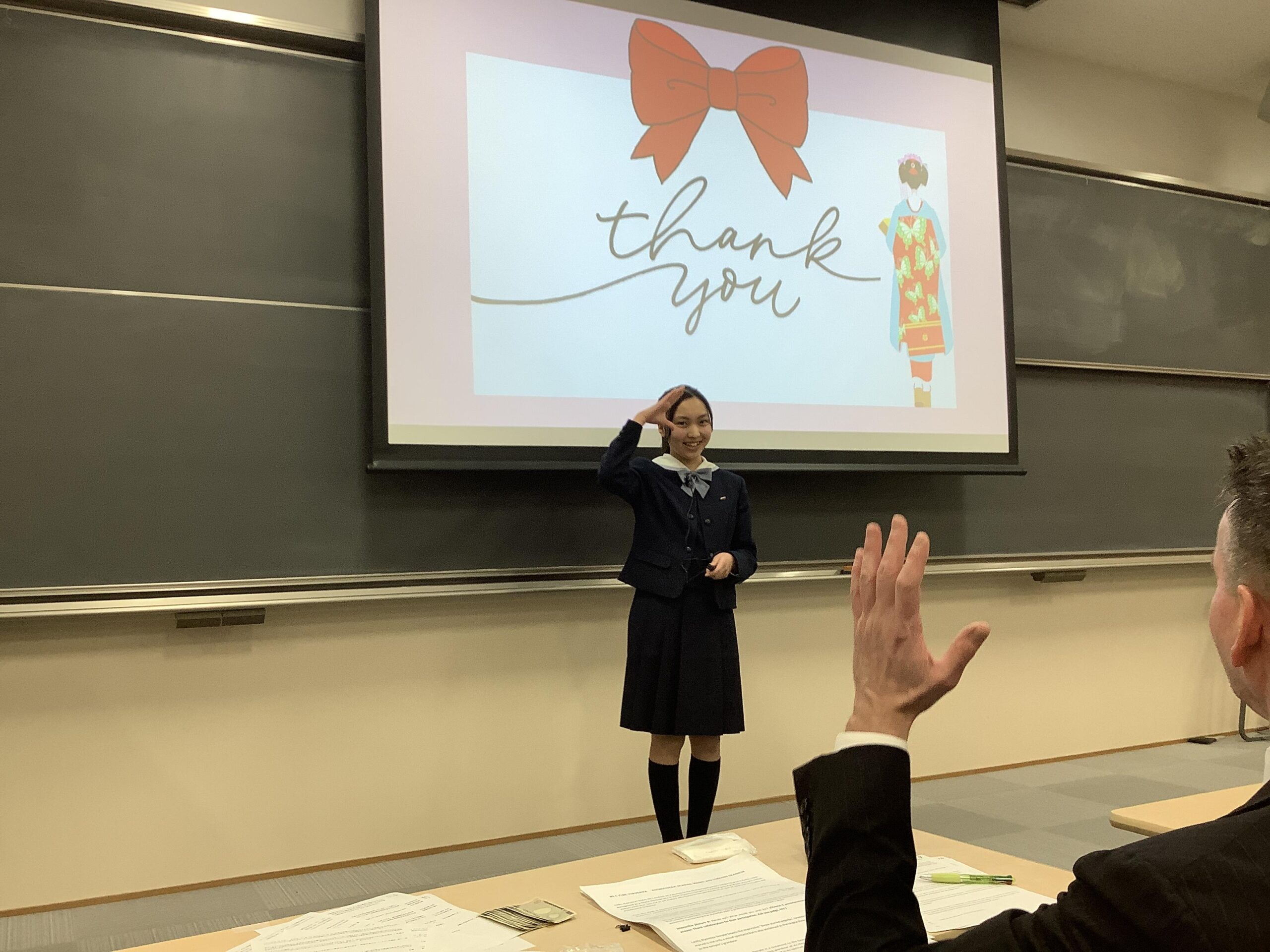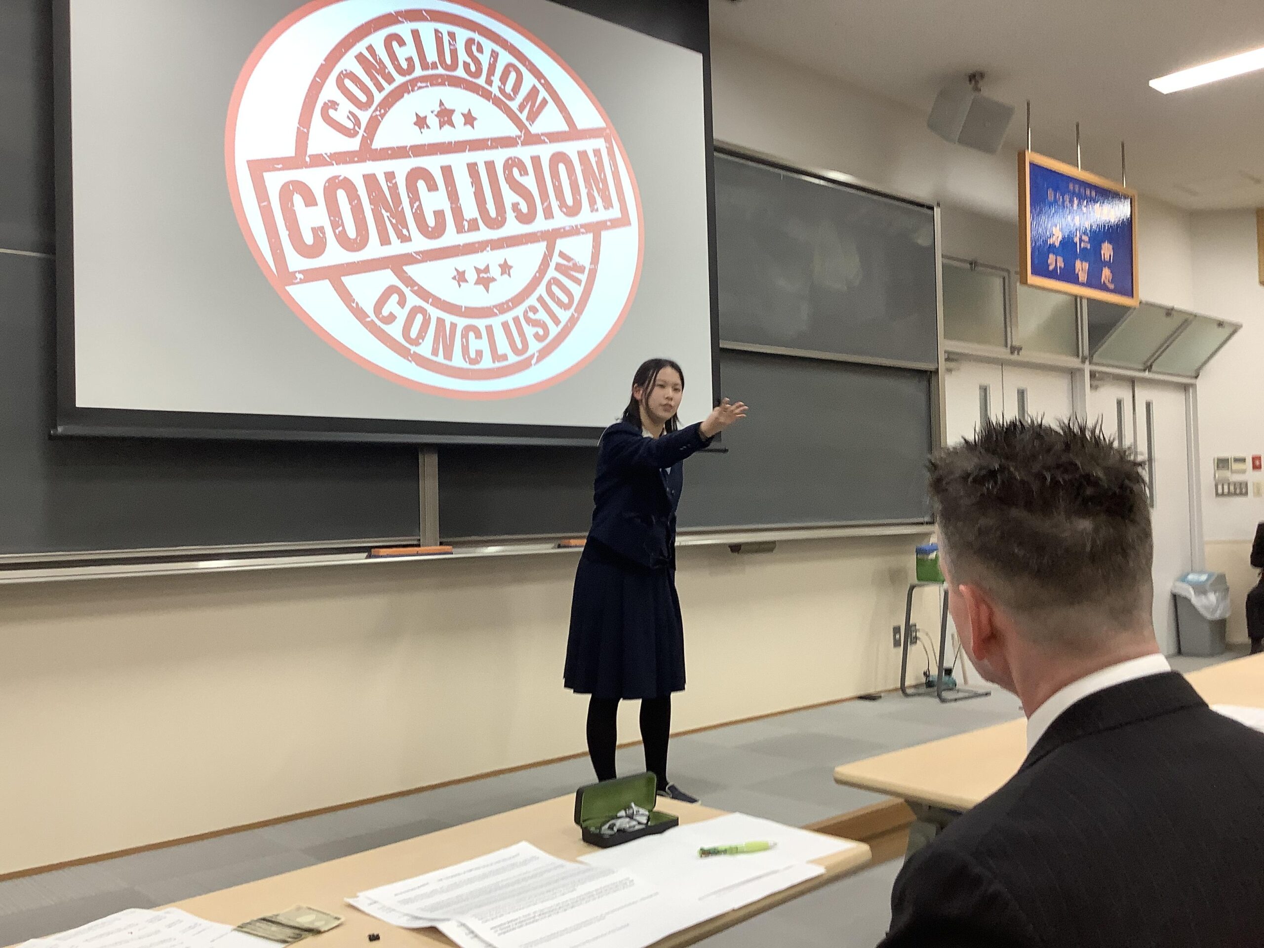出場してくれた生徒全員が350語~400語程度の英文を暗記し、ジェスチャーをまじえ、観客に質問をし、舞台上を歩き回って、すばらしく力強いプレゼンテーションを披露してくれました。