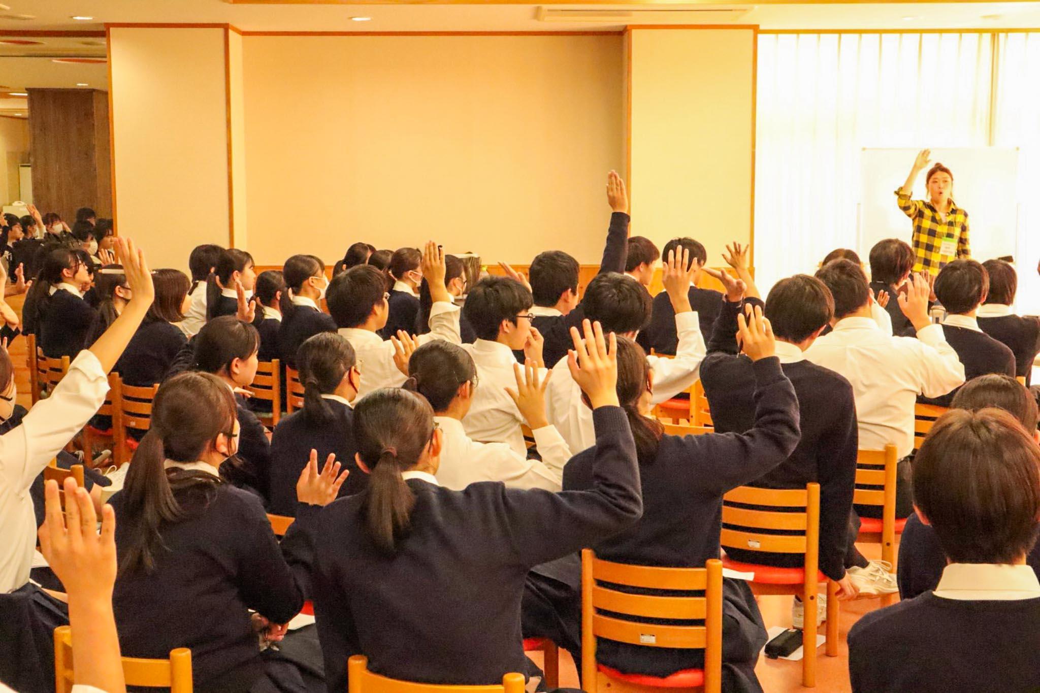 こうしたさまざまな人が共に生きる社会で意識すべき価値観のひとつとして「ダイバーシティ(多様性)」という概念が定着しています。講演では「性」に関するさまざまな設問が用意され、生徒たちが挙手して回答しました。