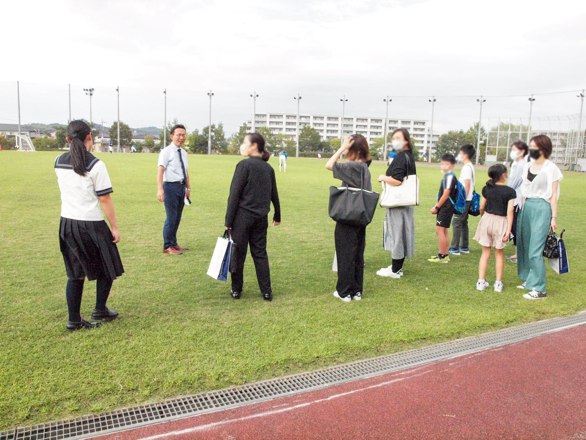 後半、令和6年度入試概要および出題方針について説明する入試説明会と、校内見学をしていただく二つのグループに分かれていただきました。校内見学では、天然芝の総合グラウンドやテニスコート、体育館などの体育施設、教室や様々な施設を教員と在校生で紹介しました。部活動中の科学部の実験に、小学生の皆さんが参加していただく場面もありました。