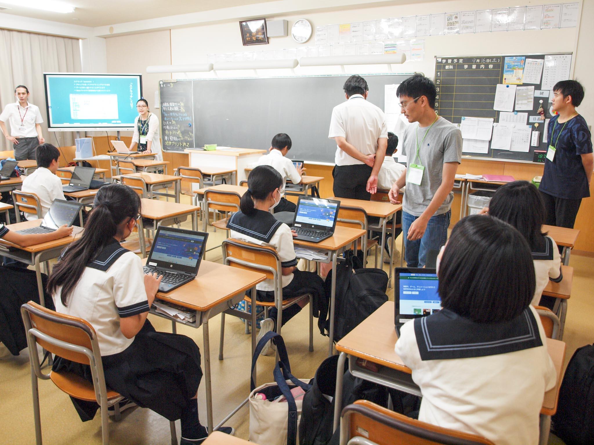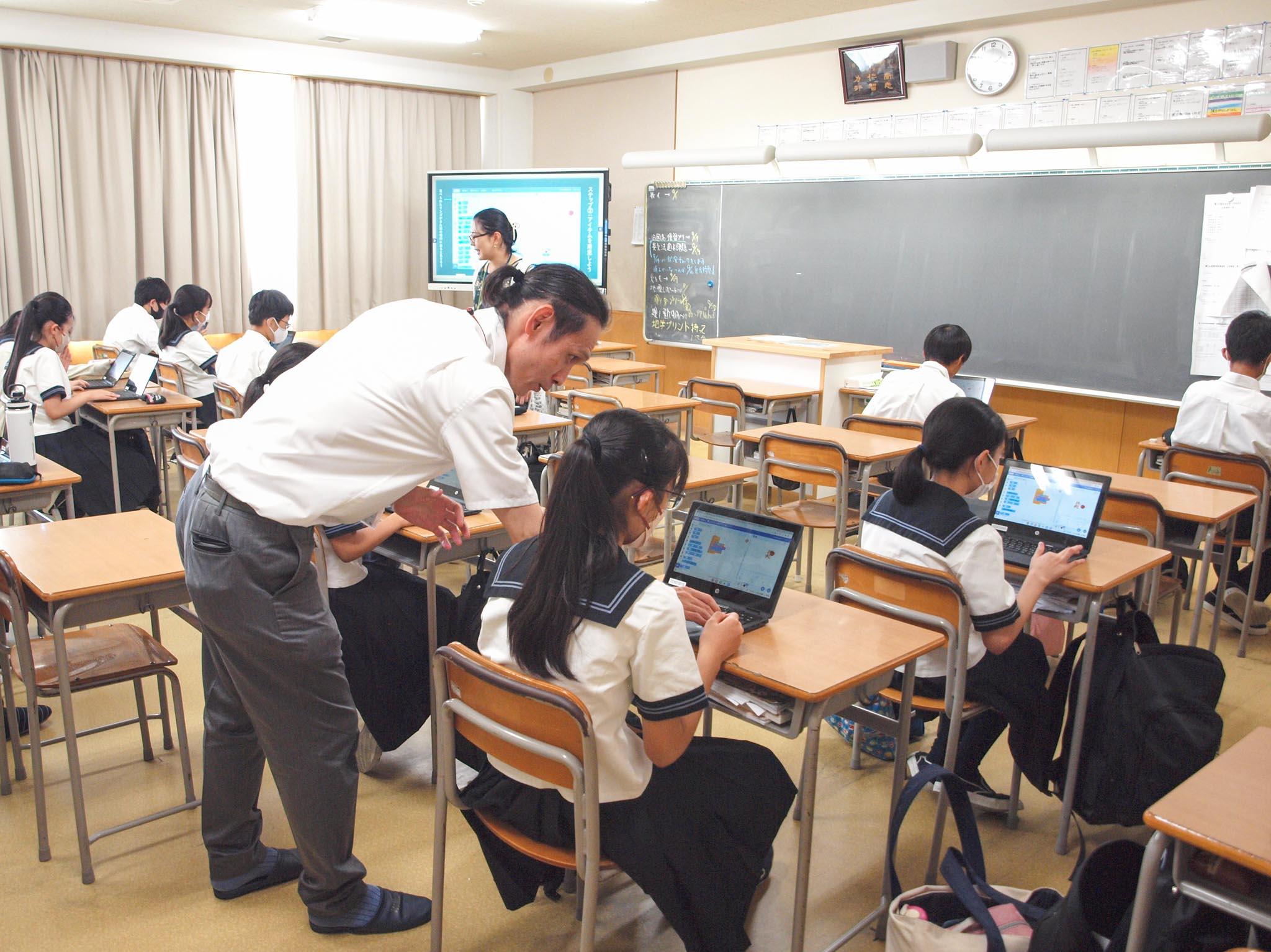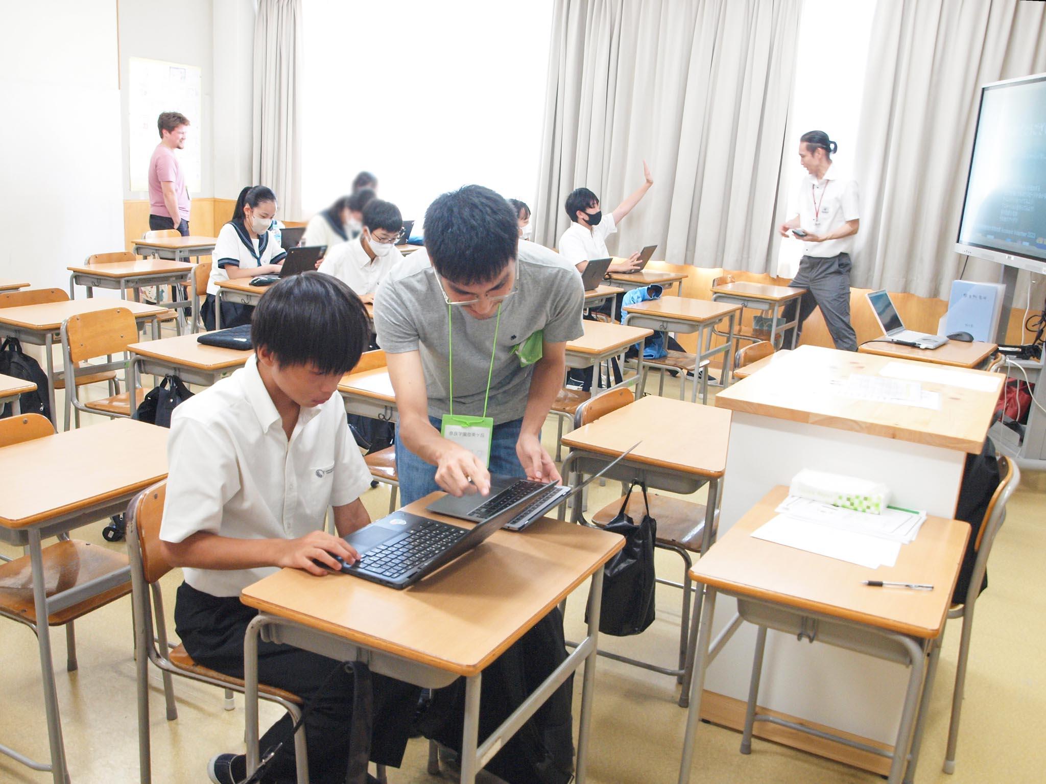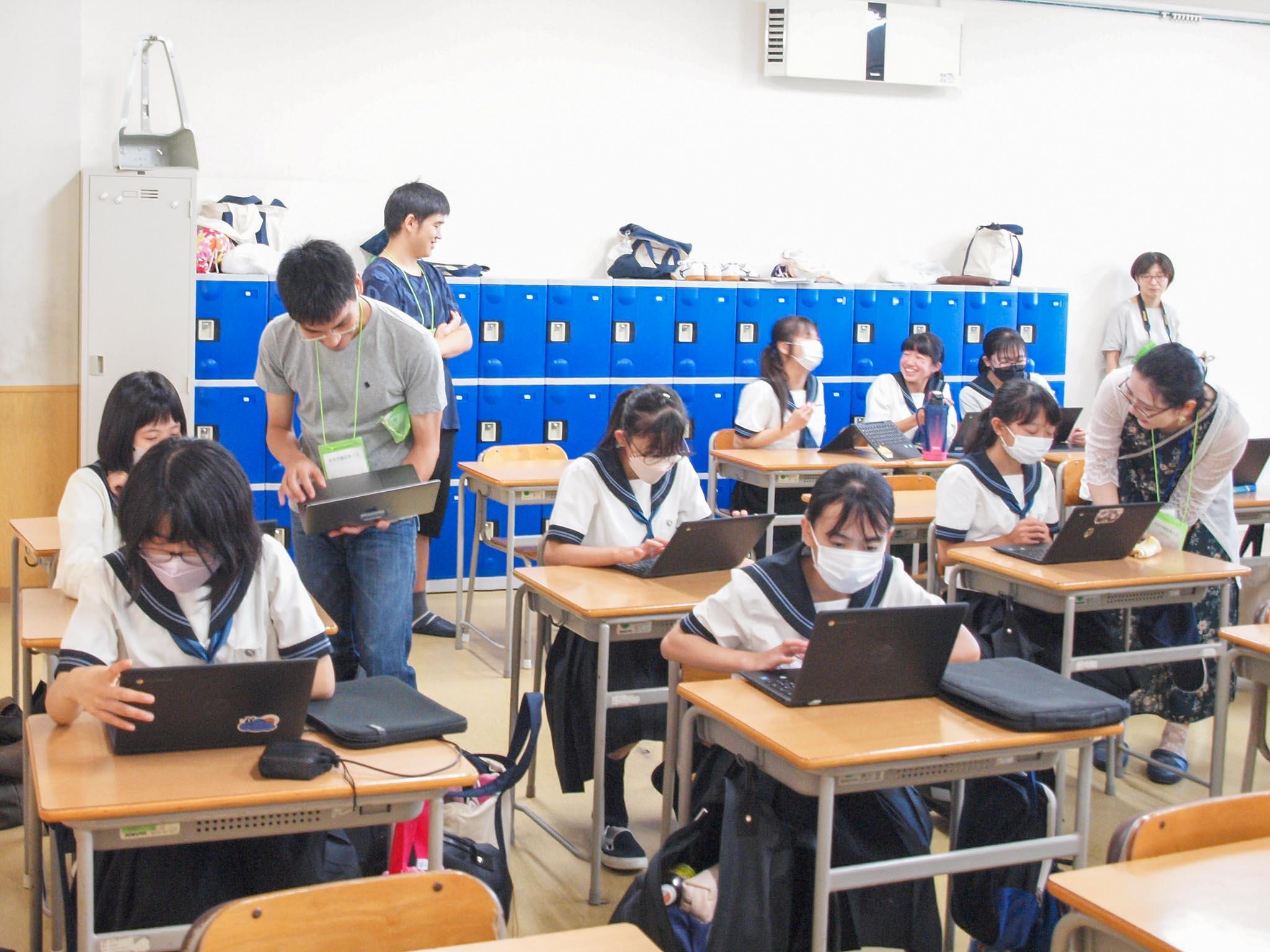最初は少し緊張気味だった生徒たちも、わからないところを久保先生やアカデミックボランティアの皆さんに親切にレクチャーしていただいて課題をこなすうちに、プログラミングの面白さに夢中になっていっていました。