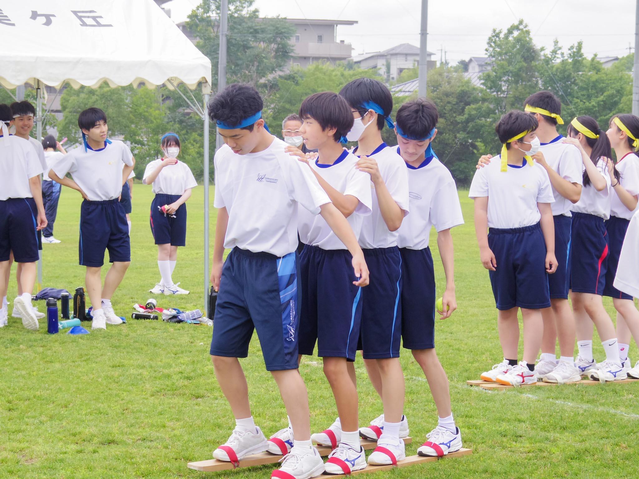 M4(中学2年)選抜競技は「○人✕脚リレー」で、1人から5人4脚まで人数の異なる走者がバトンをつなぎました。出走順は生徒たち自身で決めており、追い上げに有利な走者をどこに配置するかが勝利の鍵となりました。また、Y1(中学3年)選抜競技は障害物競走でした。おんぶ競争、二人三脚、ムカデ競争、ラケットリレーの組み合わせで、テニスボールをバトン代わりにして走りました。4人の息を合わせて走るムカデ競争では、応援する生徒たちから自然と手拍子が起こっていました。