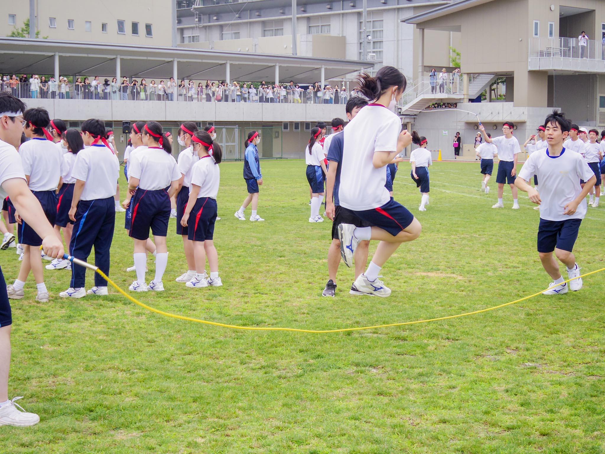 全学年対抗競技は大縄跳びでクラスごとに競いました。リズムよく入れ替わるクラスが記録を伸ばし、結果は全12クラス中の3位がM3-B、2位がM3-A、1位がY1-DでM3学年が健闘しました。